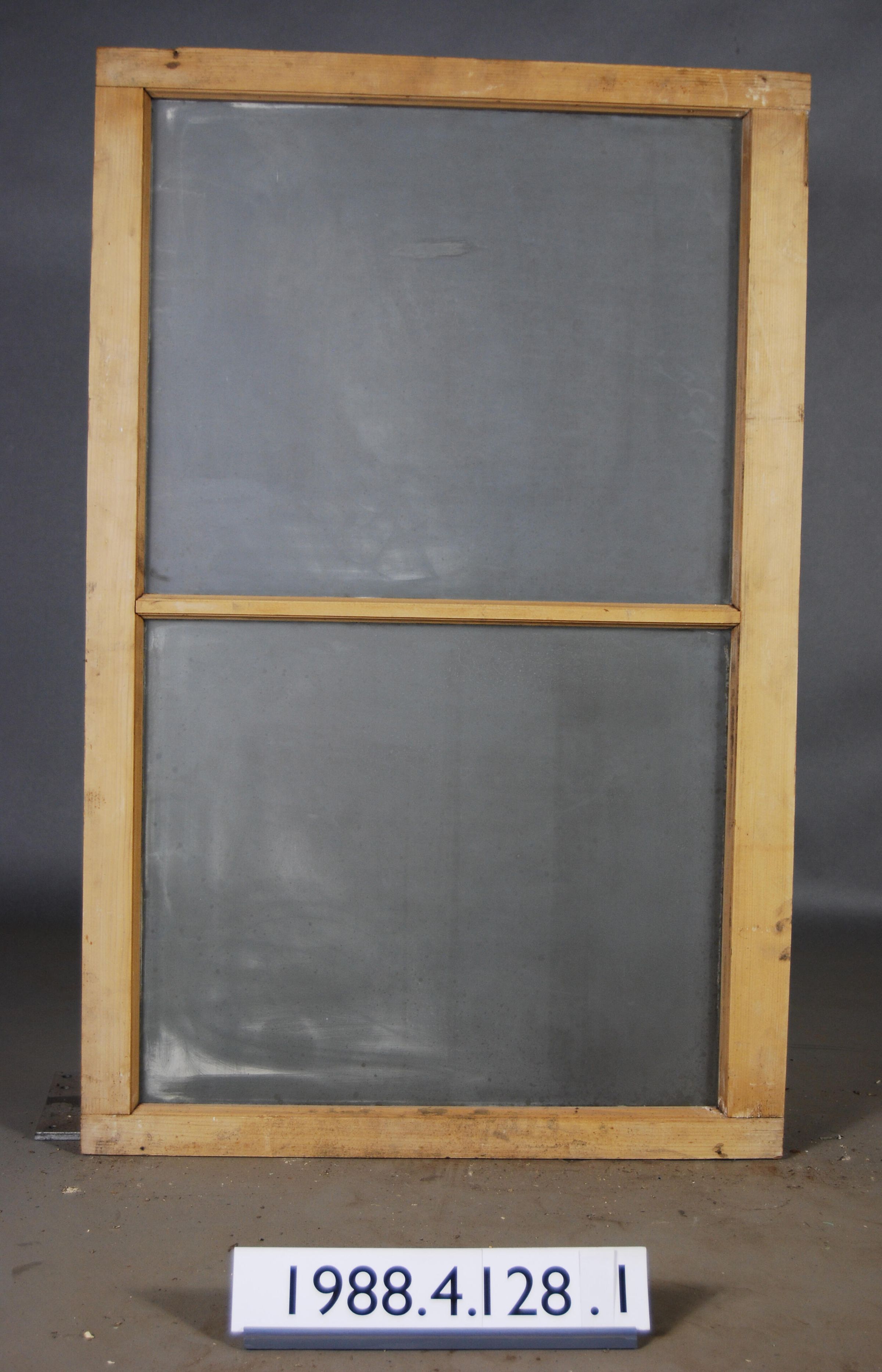 Rectangular. Mortice and tenon and coped joints. Two openings with complete frosted glass panes. Type: Fixed sash. Inscriptions or Markings: Manufacturer: Place of Manufacturer: Design motif: Style: Finish: Unpainted.