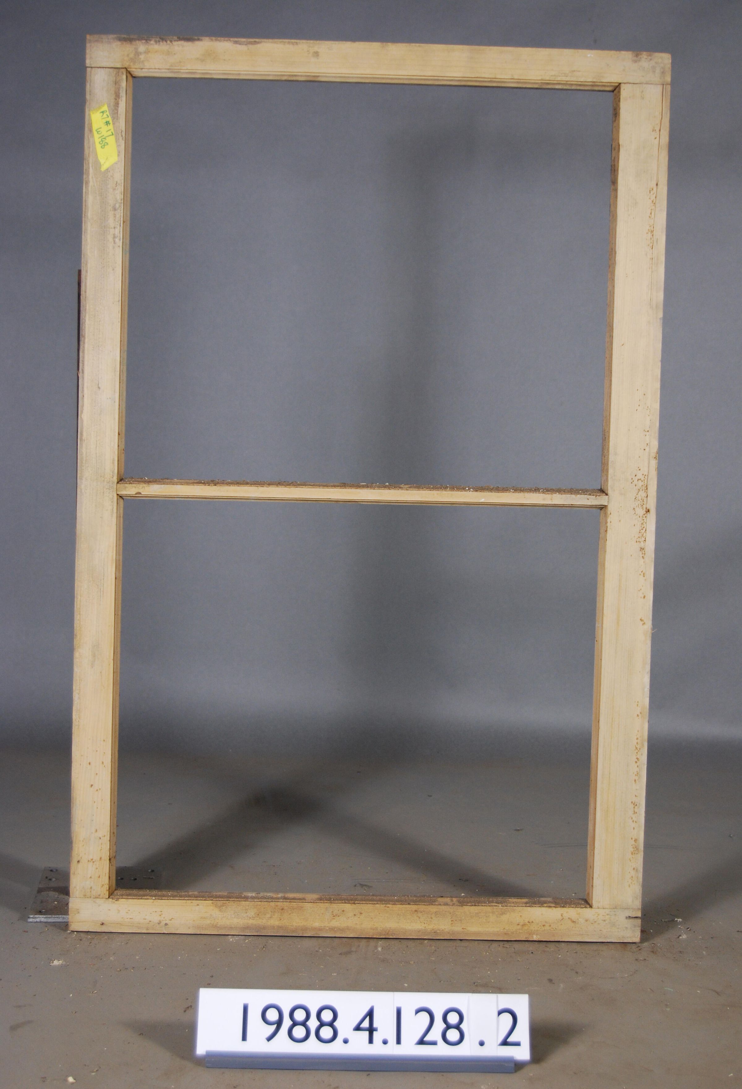 Rectangular. Mortice and tenon and coped joints. Two openings, both with panes missing. Type: Fixed sash. Inscriptions or Markings: Manufacturer: Place of Manufacturer: Design motif: Style: Finish: Unpainted.