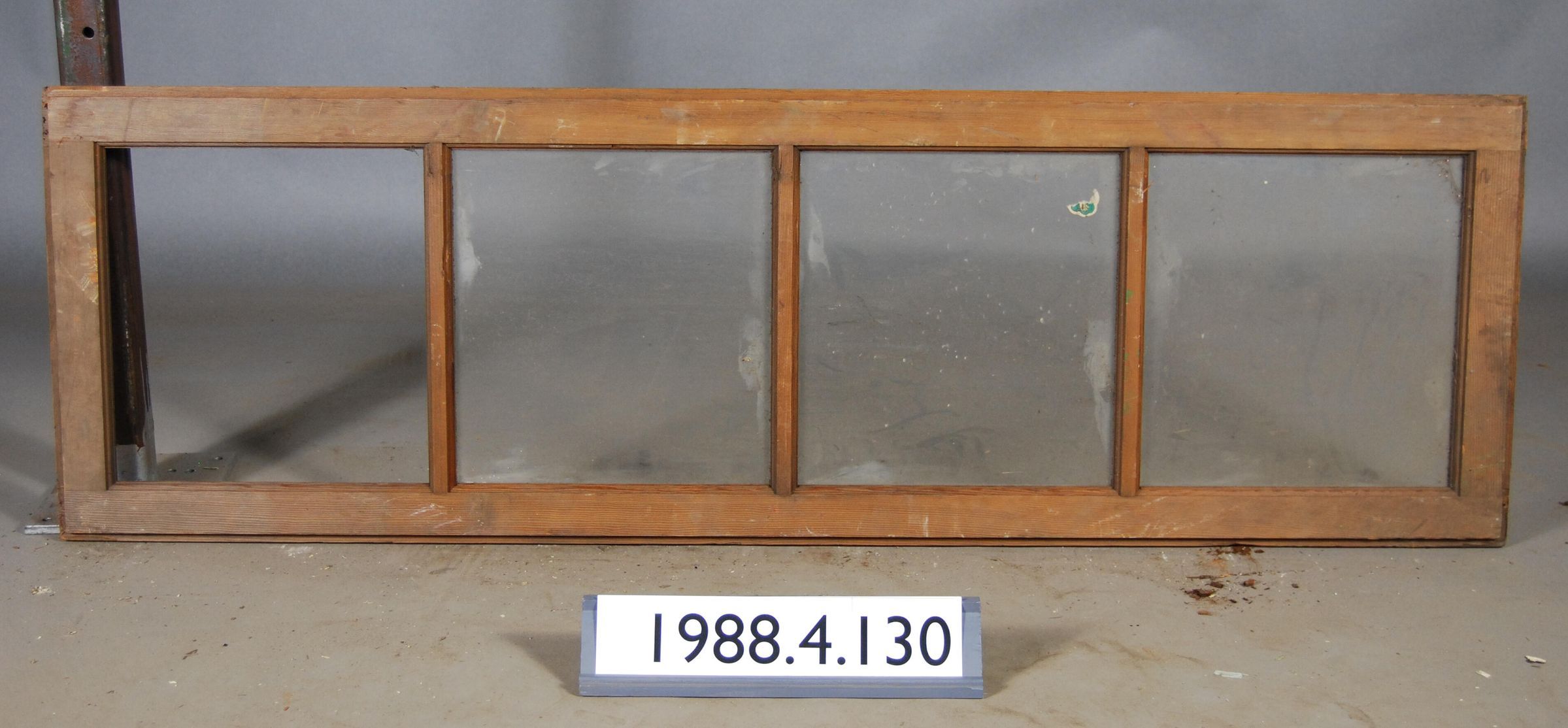 Rectangular. Mortice and tenon and coped joints. Segmented. Four openings. Three complete glass panes. Remnant of original glass company label. One missing glass pane. Rabbeted perimeter edges.