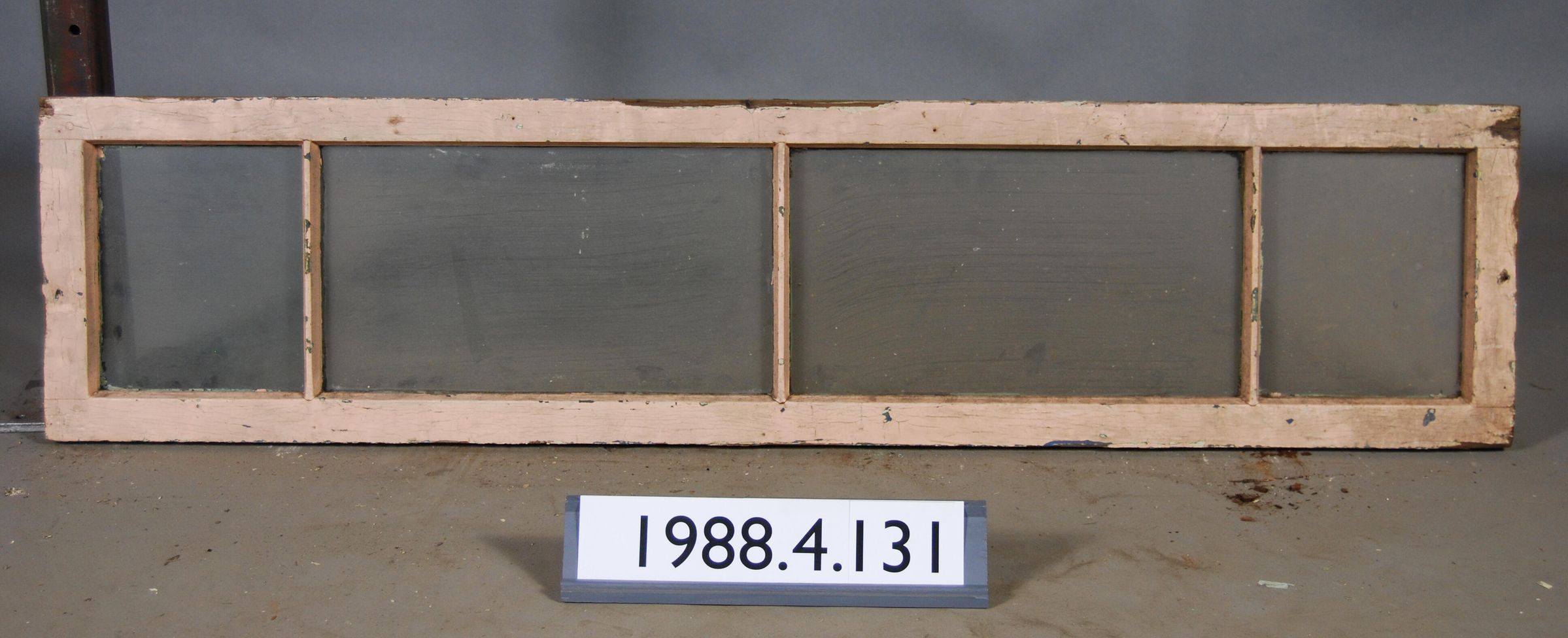 Rectangular. Mortice and tenon and coped joints. Segmented. Four openings with complete glass panes. Consists of smaller pane at top and bottom of sash and two larger panes aligned vertically at mid point.