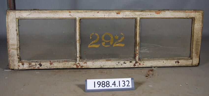 Rectangular. Mortice and tenon and coped joints. Segmented. Three openings with complete glass panes. Center pane has gold leaf numerals: "292." Upper rail has two hinges mounted on interior side.