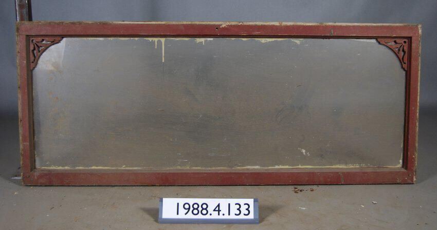 Rectangular. Mortice and tenon and coped joints. Complete glass pane. Has ornamental fret work mounted at each corner of upper sash.