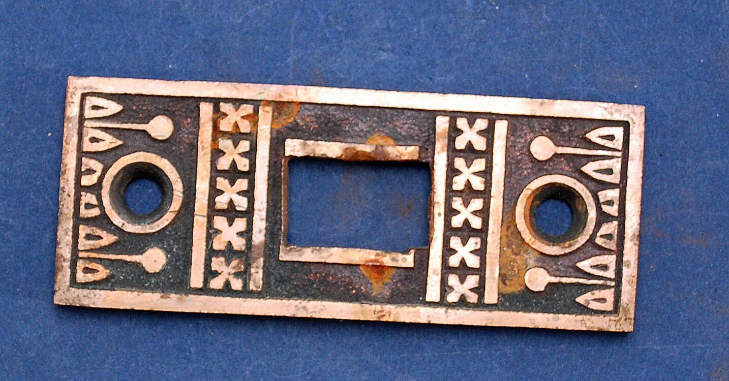 Design Name: Manufacturer: Lockwood Mfg. Co. Style: Material: Bronze Manufacturing Method: Cast Surface Finish: Aged / Unpolished VDA Classification: VDA Number: Shape: Patent Specifics: Lock Type (If Applicable): Inscription/Makers Mark: Inscription Text: Comments: Strike Plate for a Vertical Sliding Bolt as Found in Use On Double Doors.