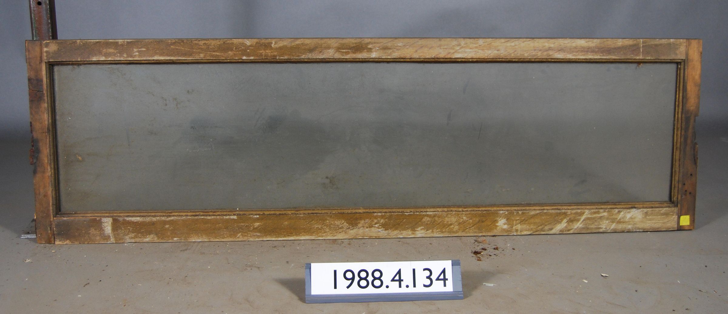 Rectangular. Mortice and tenon and coped joints. Has oak mouldings and veneer (portions of veneer missing). Complete glass pane. Has cast iron pivot hardware on side of each stile.