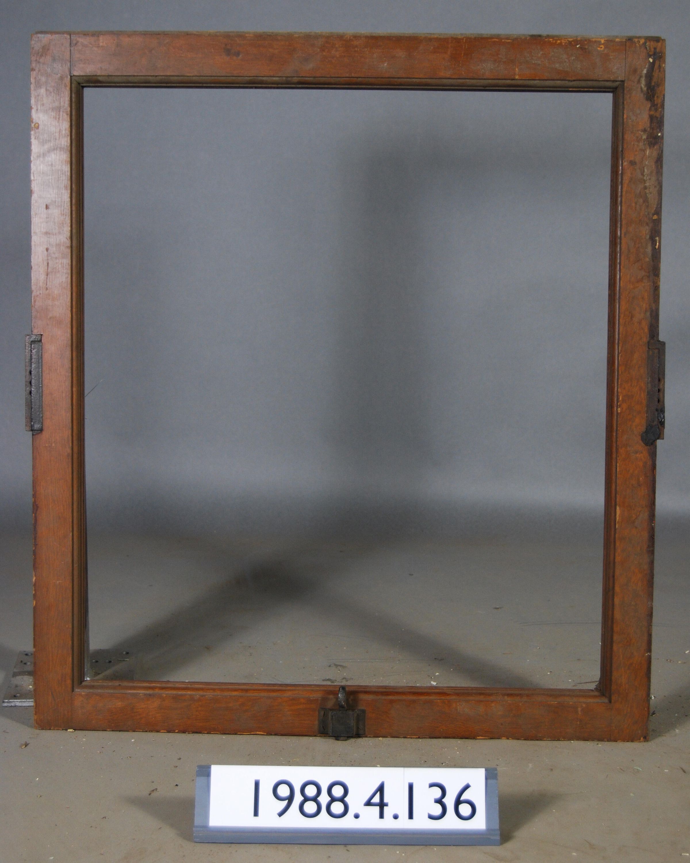 Rectangular. Mortice and tenon and coped joints. Oak rabbeted on top and bottom edge. Has cast iron pivots on each side of stile with manufacturers mark: Monarch MFG. Detroit Mich. Has spring latch at top.