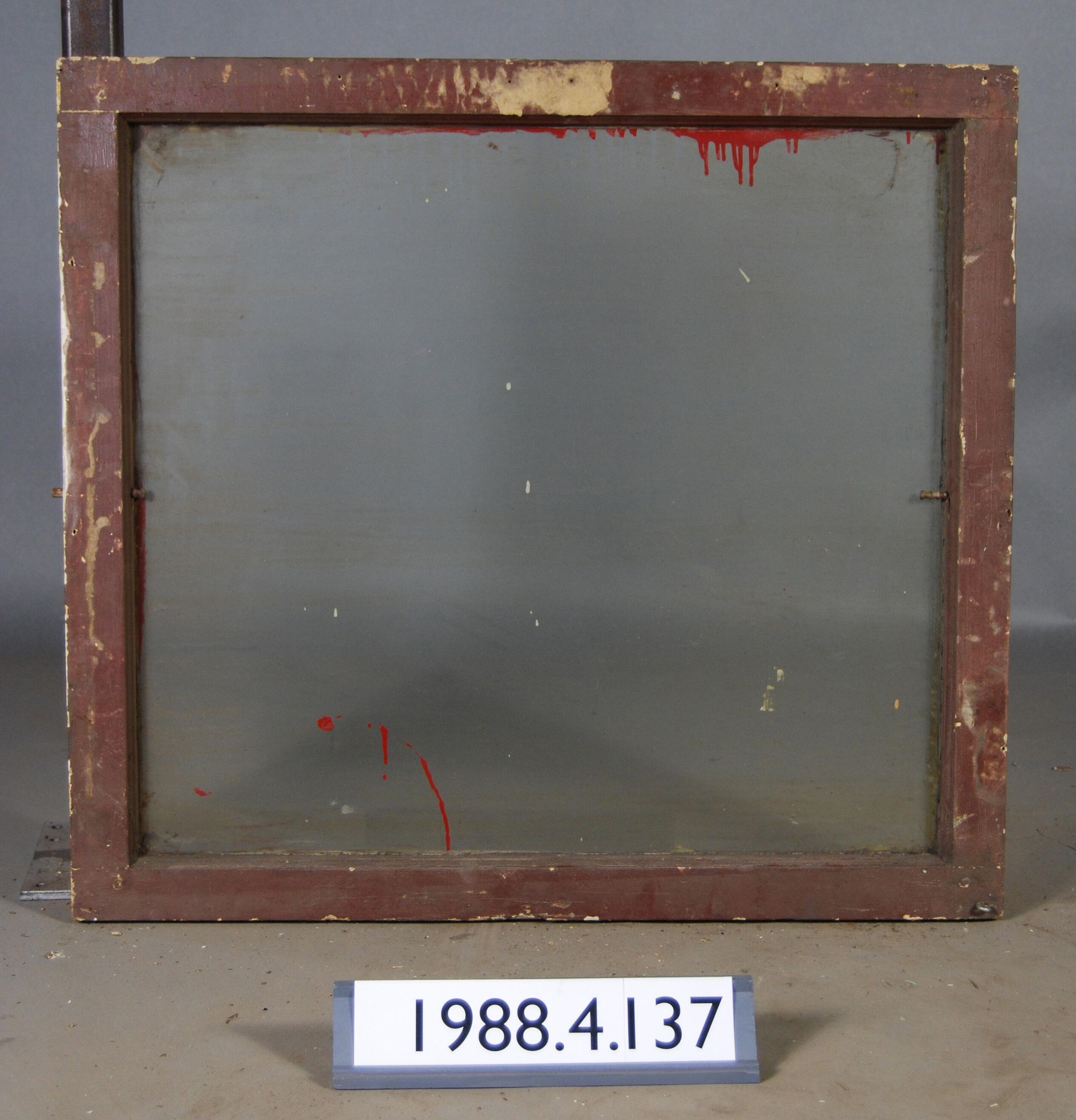 Rectangular. Mortice and tenon and coped joints. Complete glass pane. Has two spring bolts. Type: Transom. Inscriptions or Markings: Manufacturer: Place of Manufacturer: Design motif: Style: Finish: Painted.
