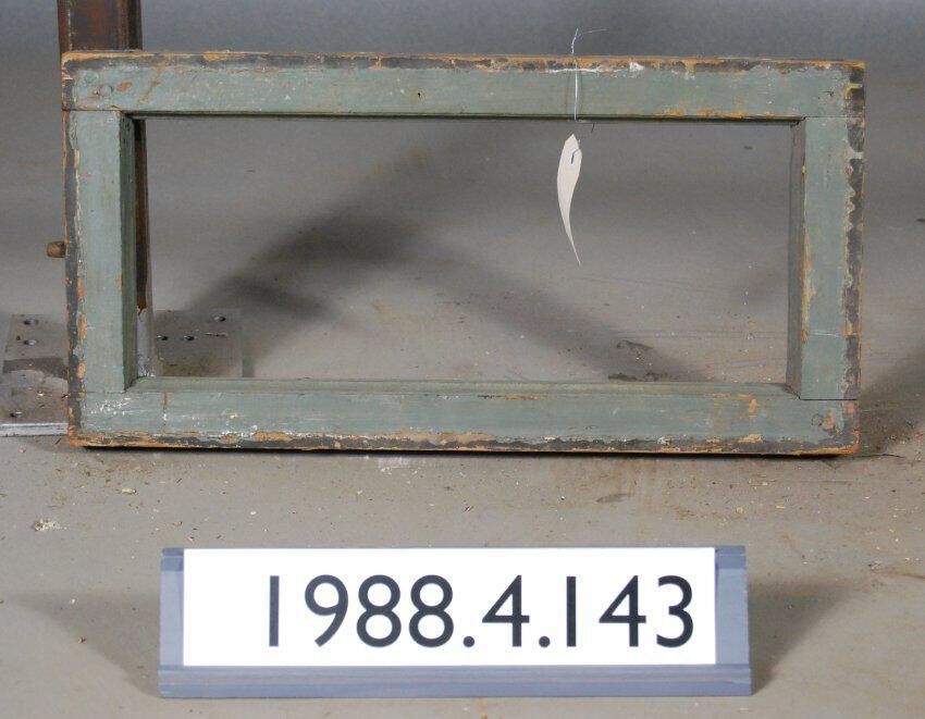 Rectangular. Mortice and tenon and coped joints. Glass pane missing. Has wood peg at center of one rail.