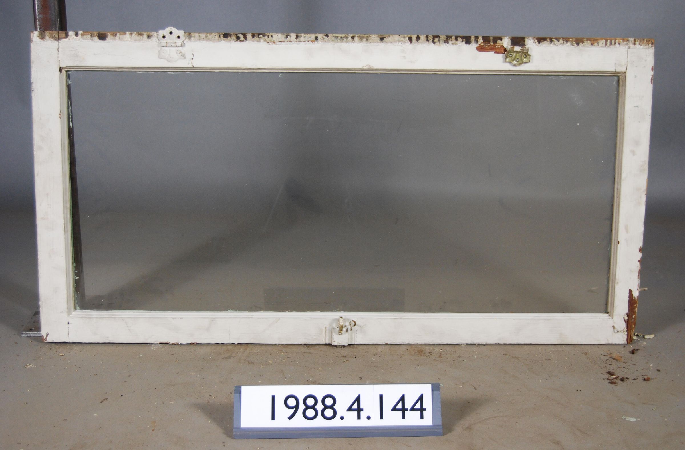 Rectangular. Mortice and tenon and coped joints. Complete glass pane. Has spring latch. Has two butterfly hinges. Type: Transom sash (possibly). Inscriptions or Markings: Manufacturer: Place of Manufacturer: Design motif: Style: Finish: Painted.
