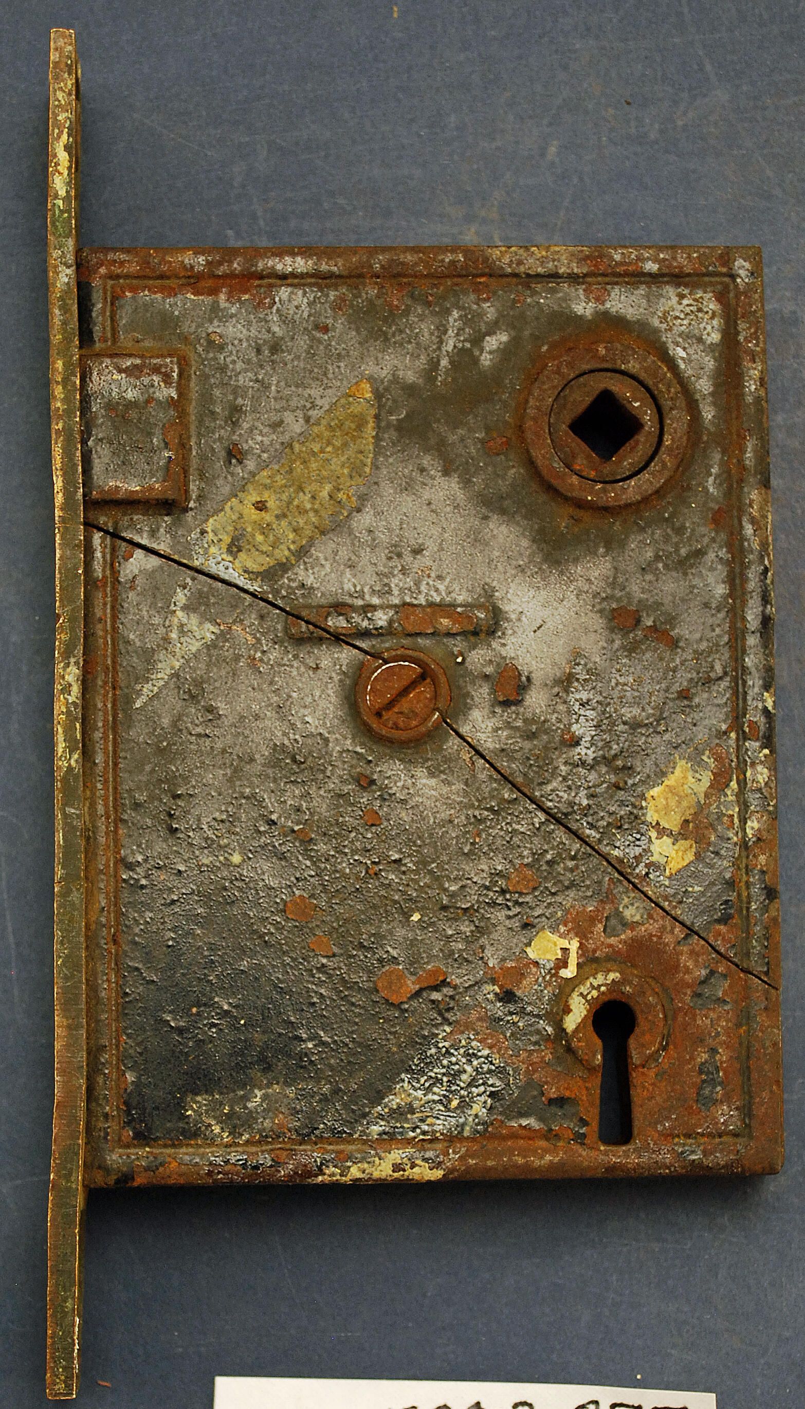 Comments: Cast Iron Case. Ornamental Bronze Face Plate (Painted Over). Broken Case Cover. See 1988.3.197 Knob, 1988.3.876 Escutcheon.