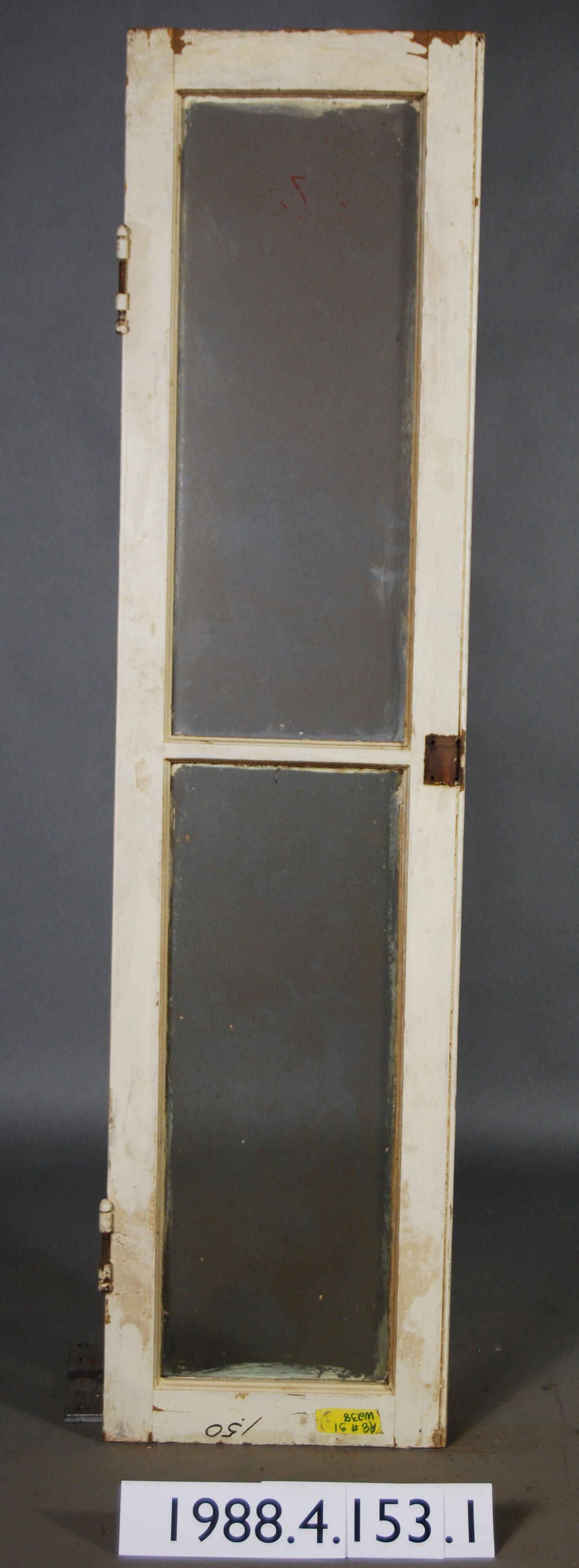 Rectangular. Mortice and tenon and coped joints. Two openings divided by horizontal muntin. Complete glass panes. Incomplete hinges mounted on stile. Latch is missing. One half of matched pair. Type: Casement sash.. Inscriptions or Markings: Manufacturer: Place of Manufacturer: Design motif: Style: Finish: Painted.