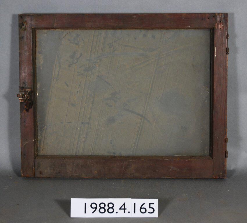 Rectangular. Mortice and tenon and coped joints. Complete glass pane. Has incomplete hinges mounted on stile. Has iron latch with brass T-handle.