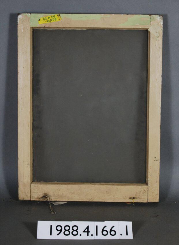 Rectangular. Mortice and tenon and coped joints. Complete glass pane. Strap hinges on upper exterior. Two eyelets at lower interior (one with short chain).