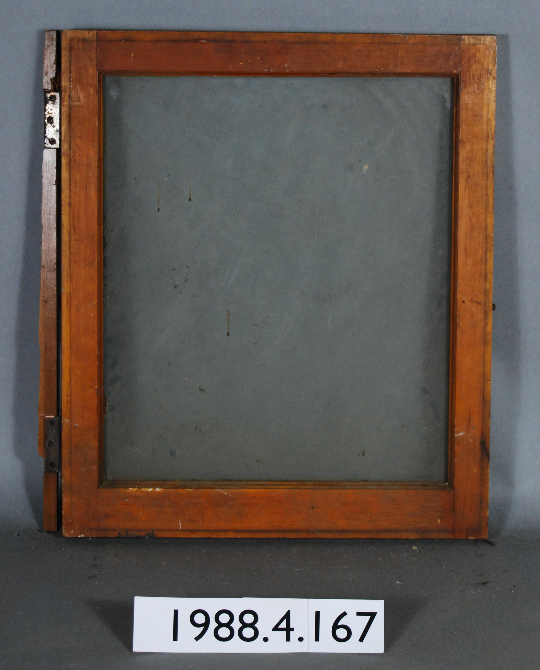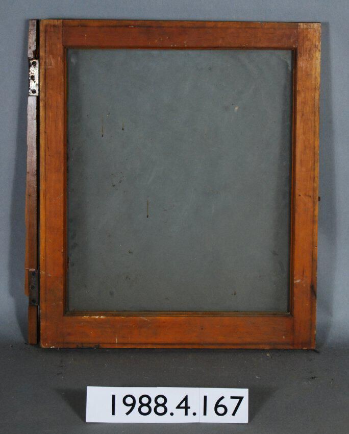 Rectangular. Mortice and tenon and coped joints. Complete glass pane. Complete butt hinges with attached frame fragment. Has spring latch.