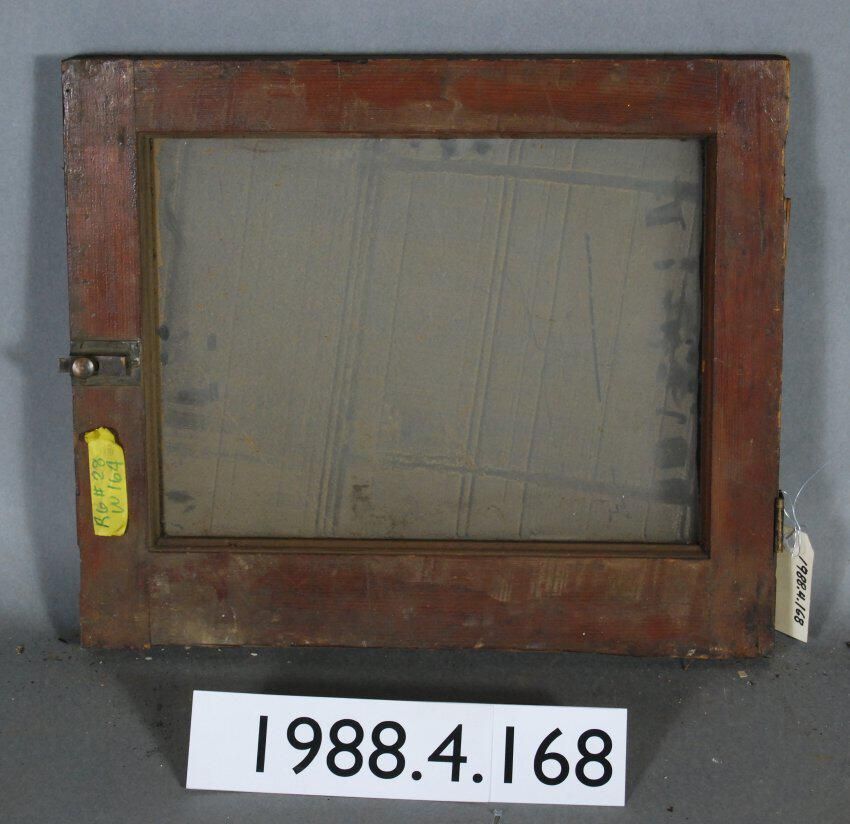 Rectangular. Mortice and tenon and coped joints. Complete glass pane. Has lower brass butt hinge. Upper hinge is missing. Has brass spring latch.
