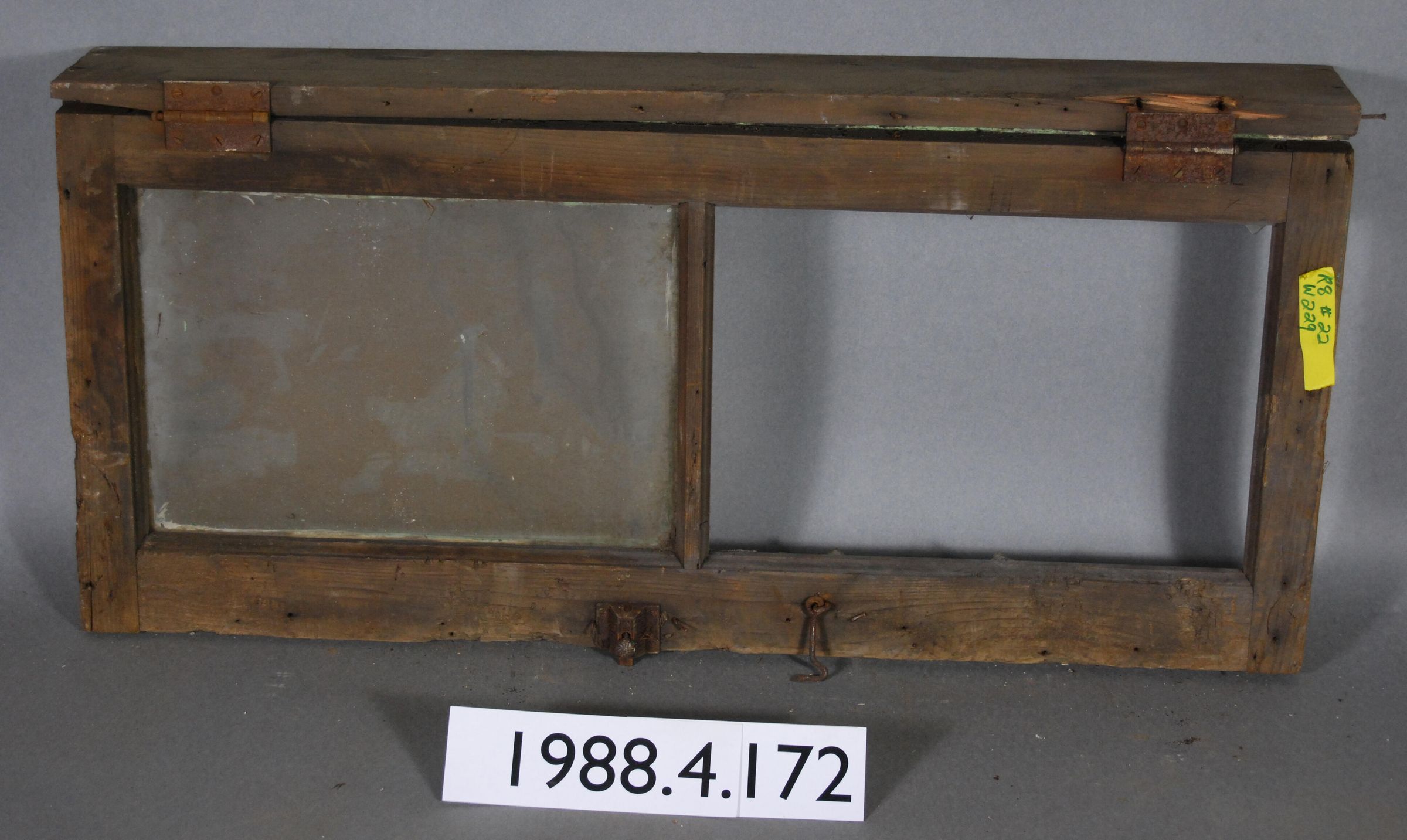 Rectangular. Mortice and tenon and coped joints. Dual openings divided by muntin. One complete glass pane. Other pane is missing. Two complete hinges. Cast iron latch. Iron hook. Attached frame section.