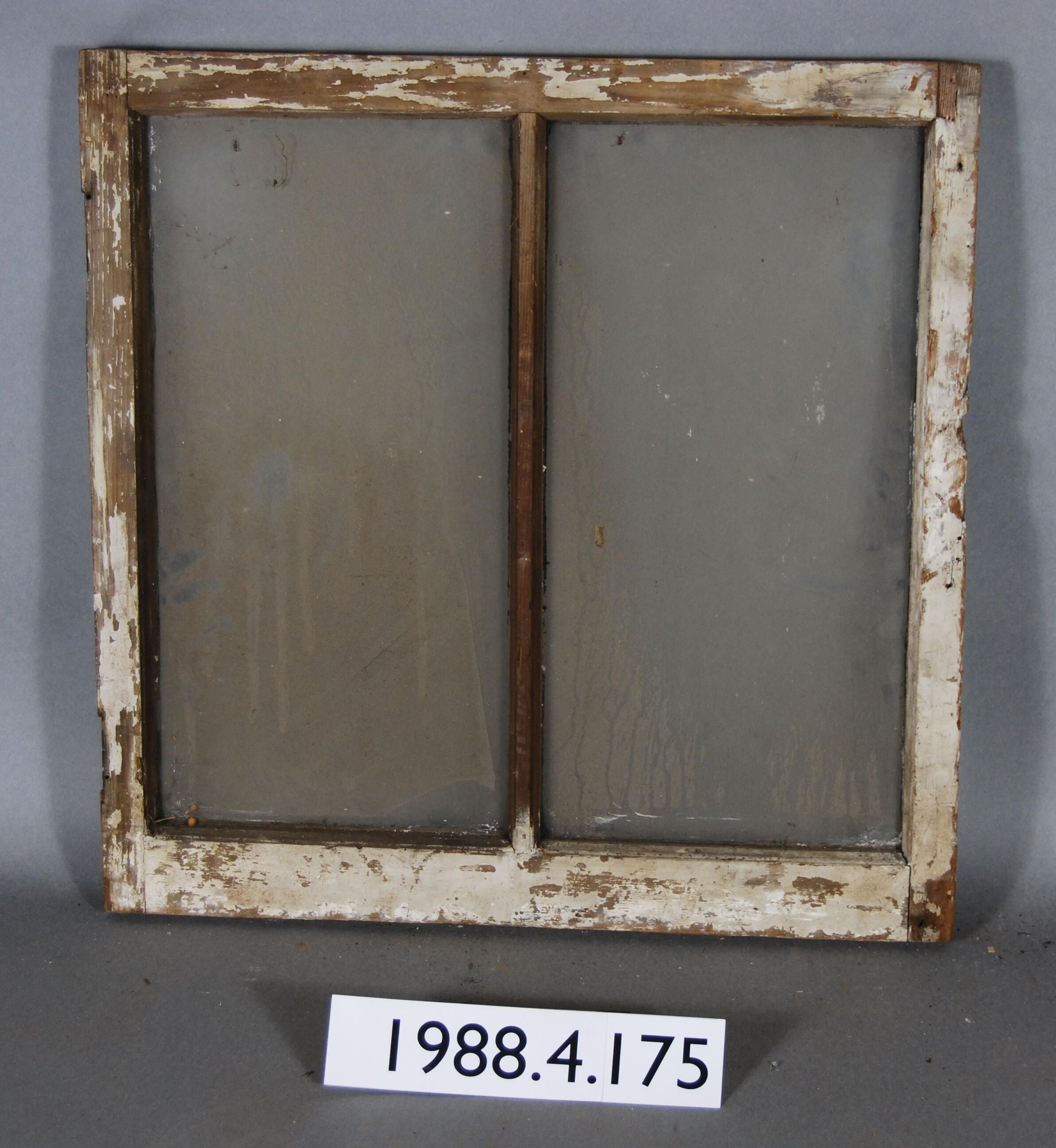 Rectangular. Mortice and tenon and coped joints. Dual openings divided by muntin. Two complete glass panes. Hinges missing. Latch missing.