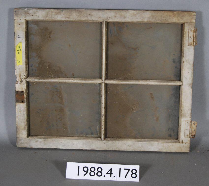 Rectangular. Mortice and tenon and coped joints. Four openings divided by muntins. Four complete glass panes. Two butt hinges mounted on surface of top rail. Partially decayed bottom rail.