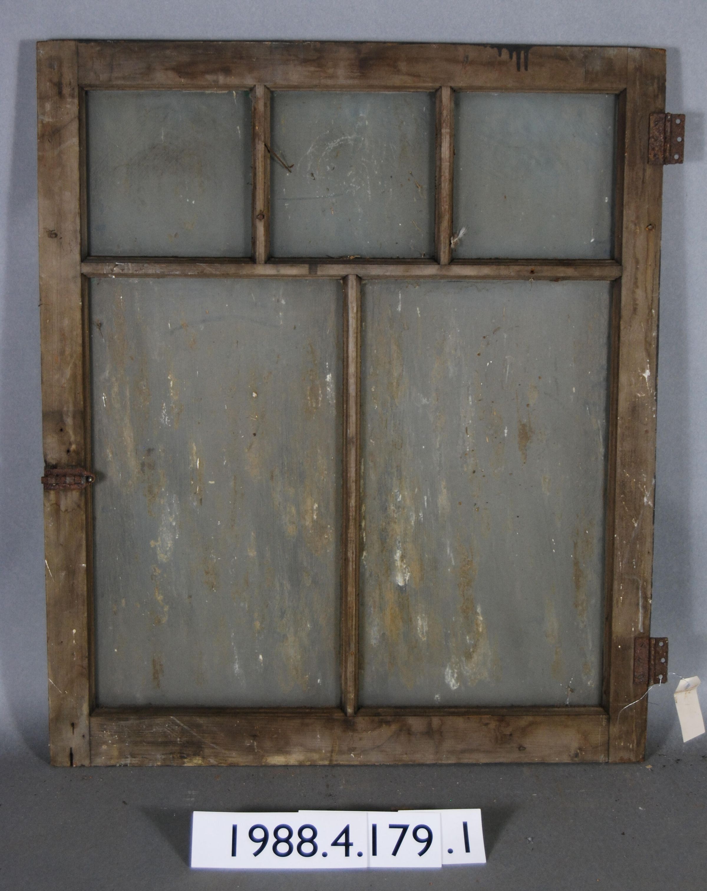 Rectangular. Mortice and tenon and coped joints. Three smaller openings above two larger openings divided by muntins. All complete glass panes. Two hinges mounted on stile. Sliding bolt on opposite stile. Unpainted interior. Painted exterior.