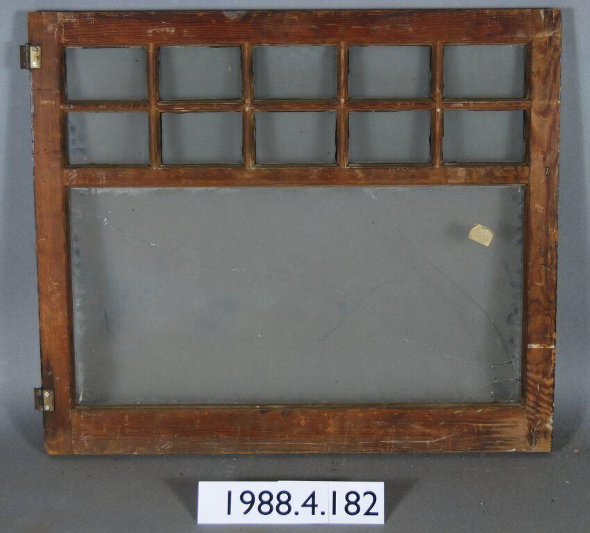 Rectangular. Mortice and tenon and coped joints. Ten small openings divided by muntins all with complete glass panes above one larger opening with broken pane. Paper label on pane: "Penvernow single strength window glass." Two hinges mounted on stile.