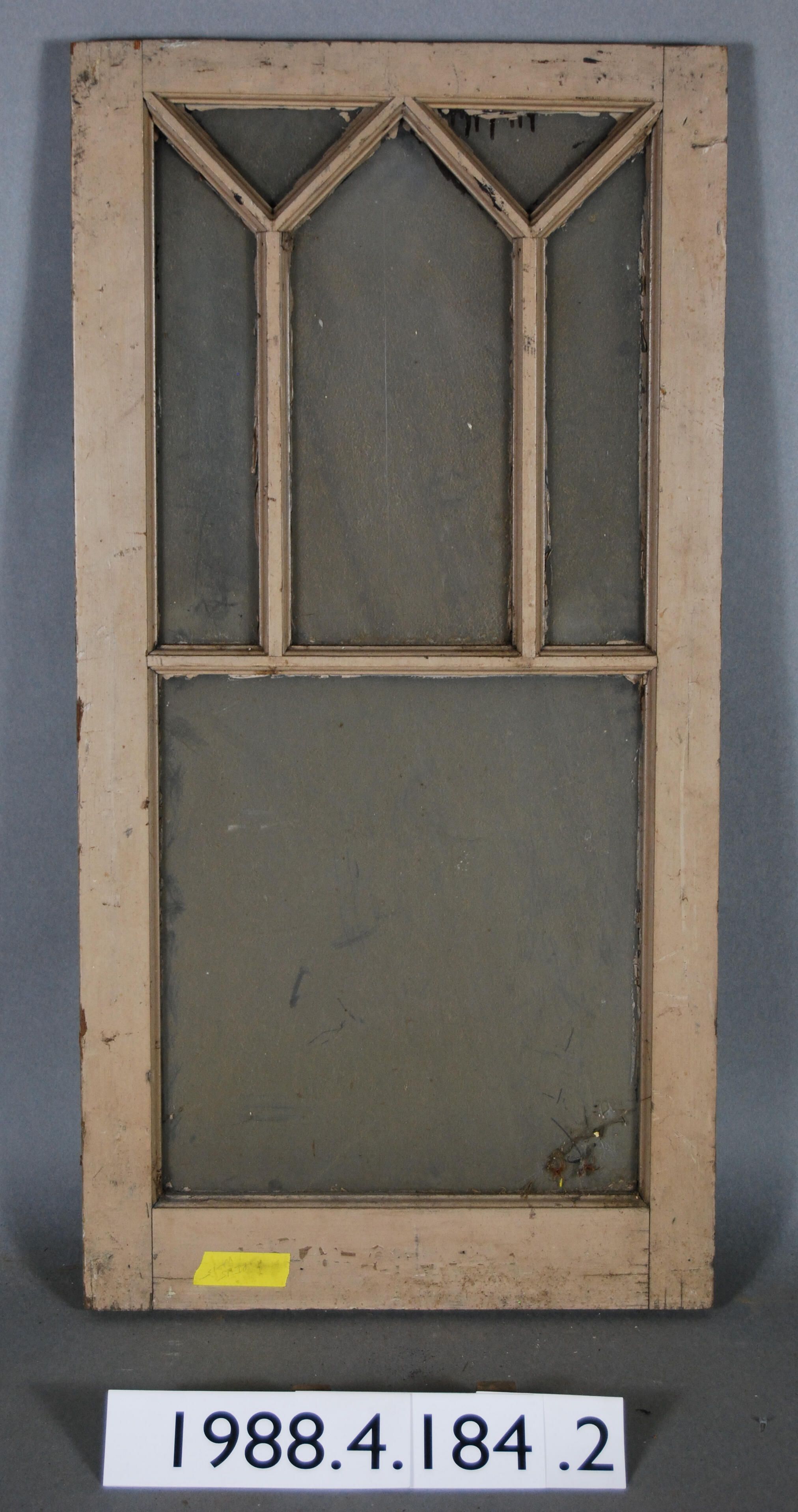 Rectangular. Mortice and tenon and coped joints. Segmented five openings divided by muntins above one larger opening, all with complete glass panes.