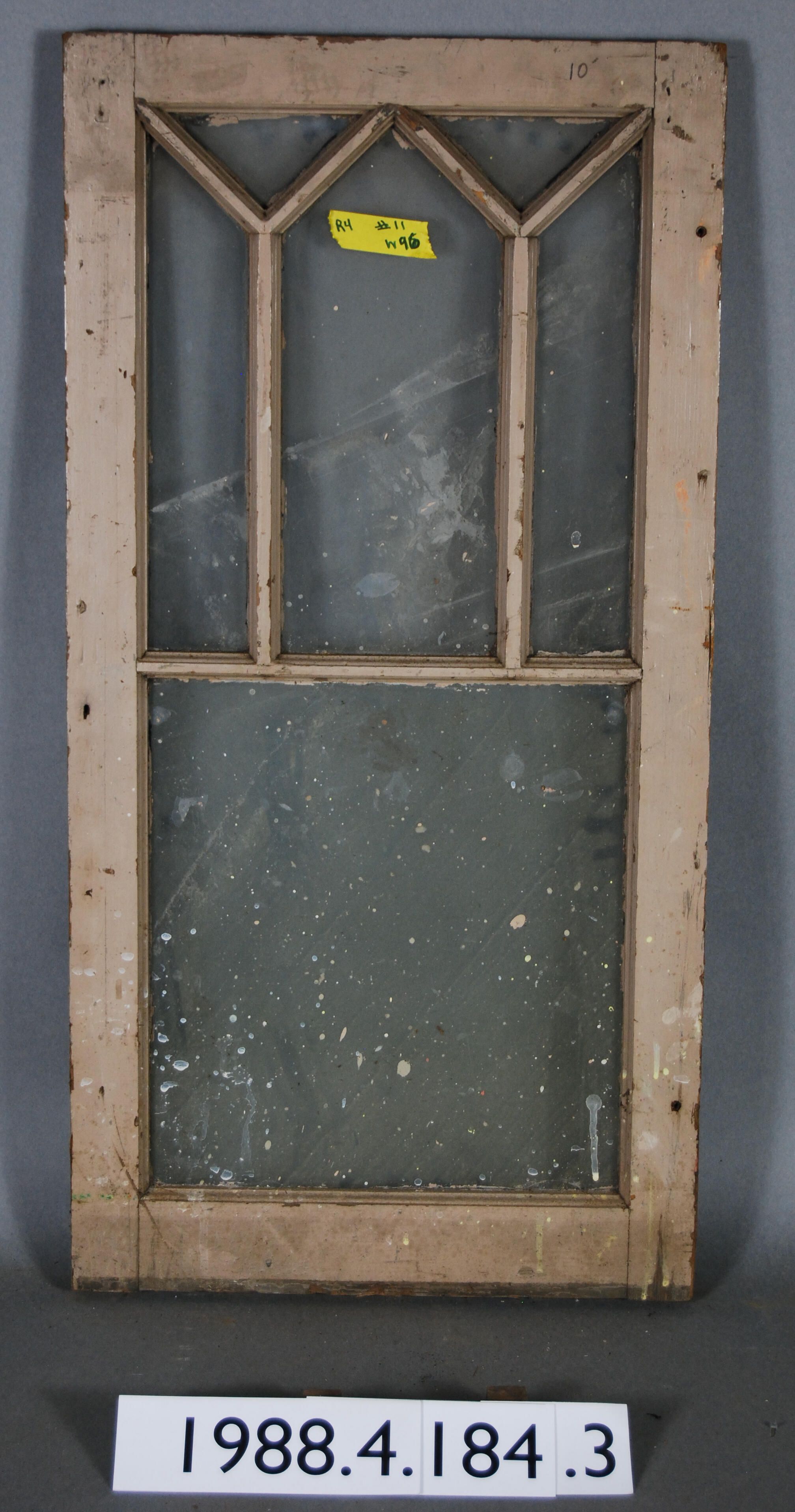 Rectangular. Mortice and tenon and coped joints. Segmented five openings divided by muntins above one larger opening, all with complete glass panes.