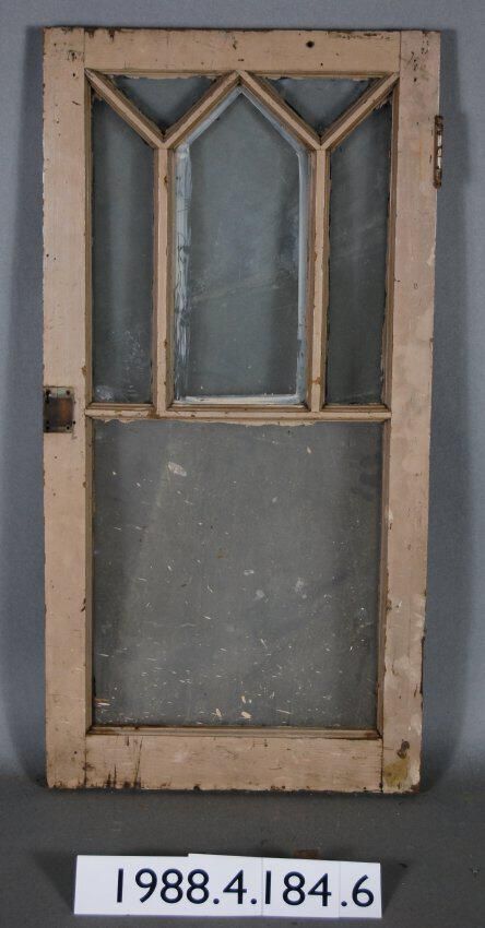 Rectangular. Mortice and tenon and coped joints. Segmented five openings with four complete glass panes and one broken pane. Divided by muntins above one opening with complete glass pane. One hinge on stile. Other hinge missing. Latch missing.