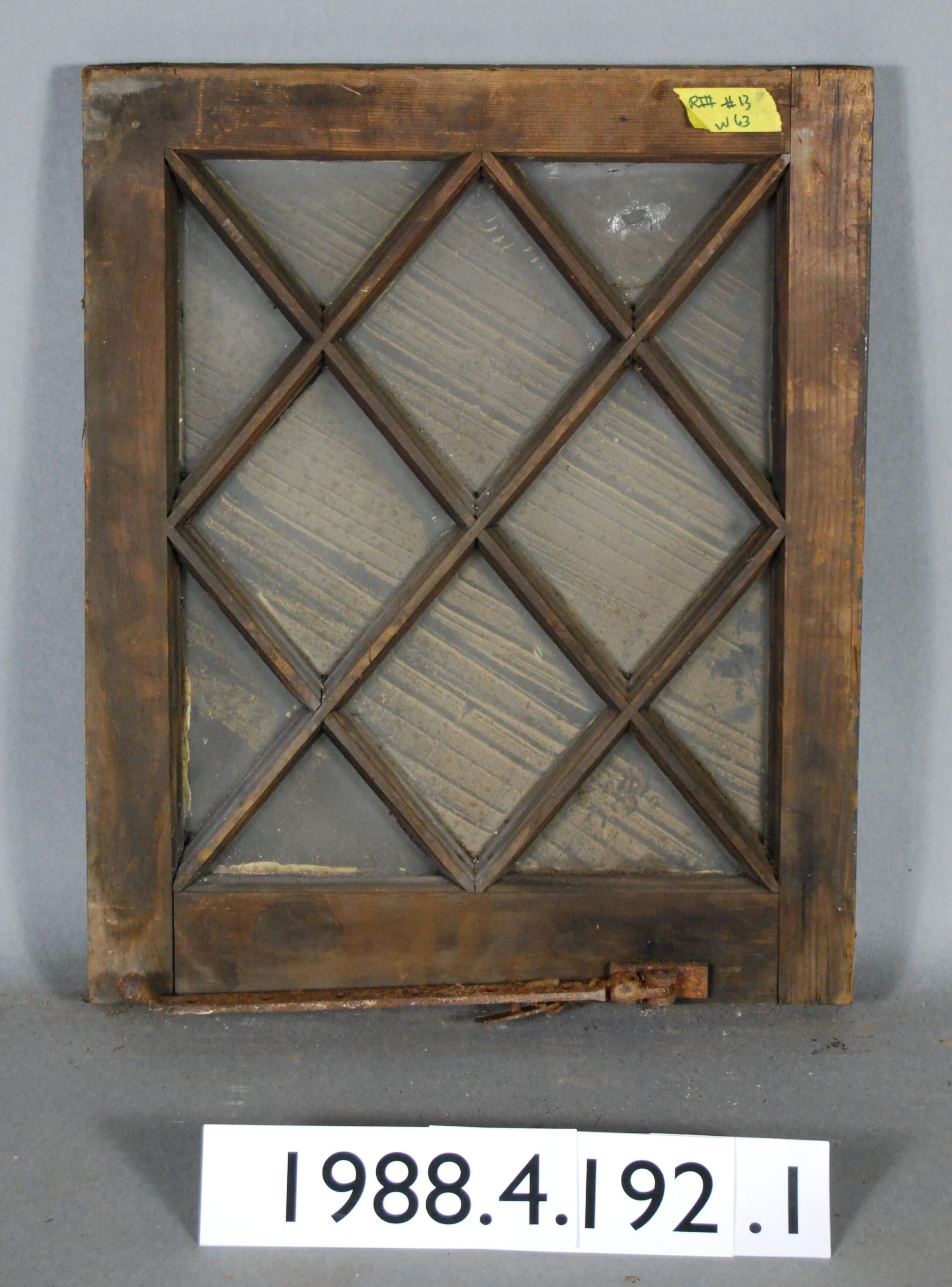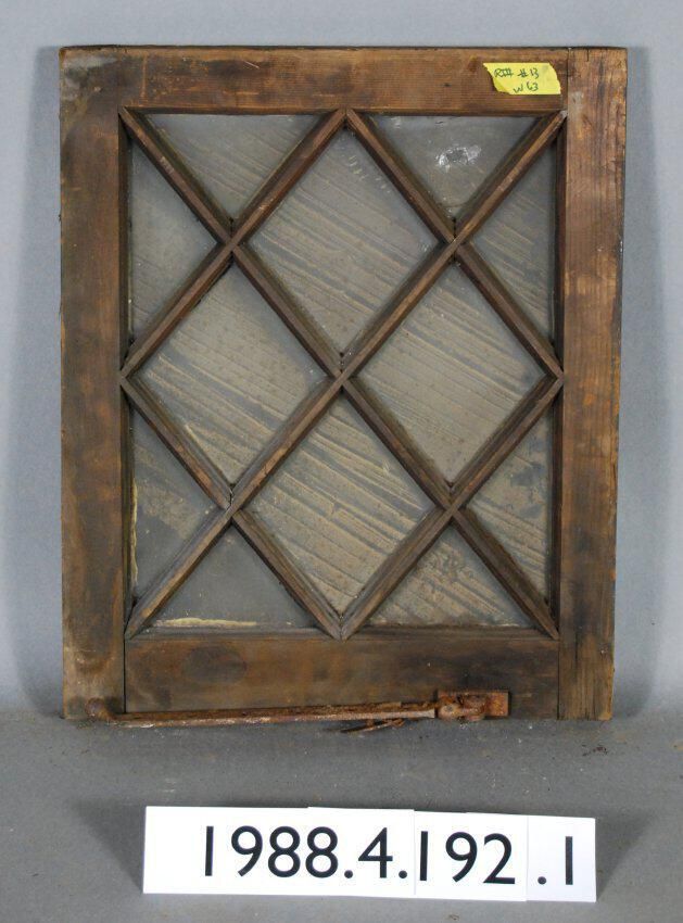 Rectangular. Mortice and tenon and coped joints. Eight triangular openings with complete glass panes and broken pane, and four diamond shaped openings with complete glass panes. Divided by muntins. Has iron adjustment lever. Hinges are missing.
