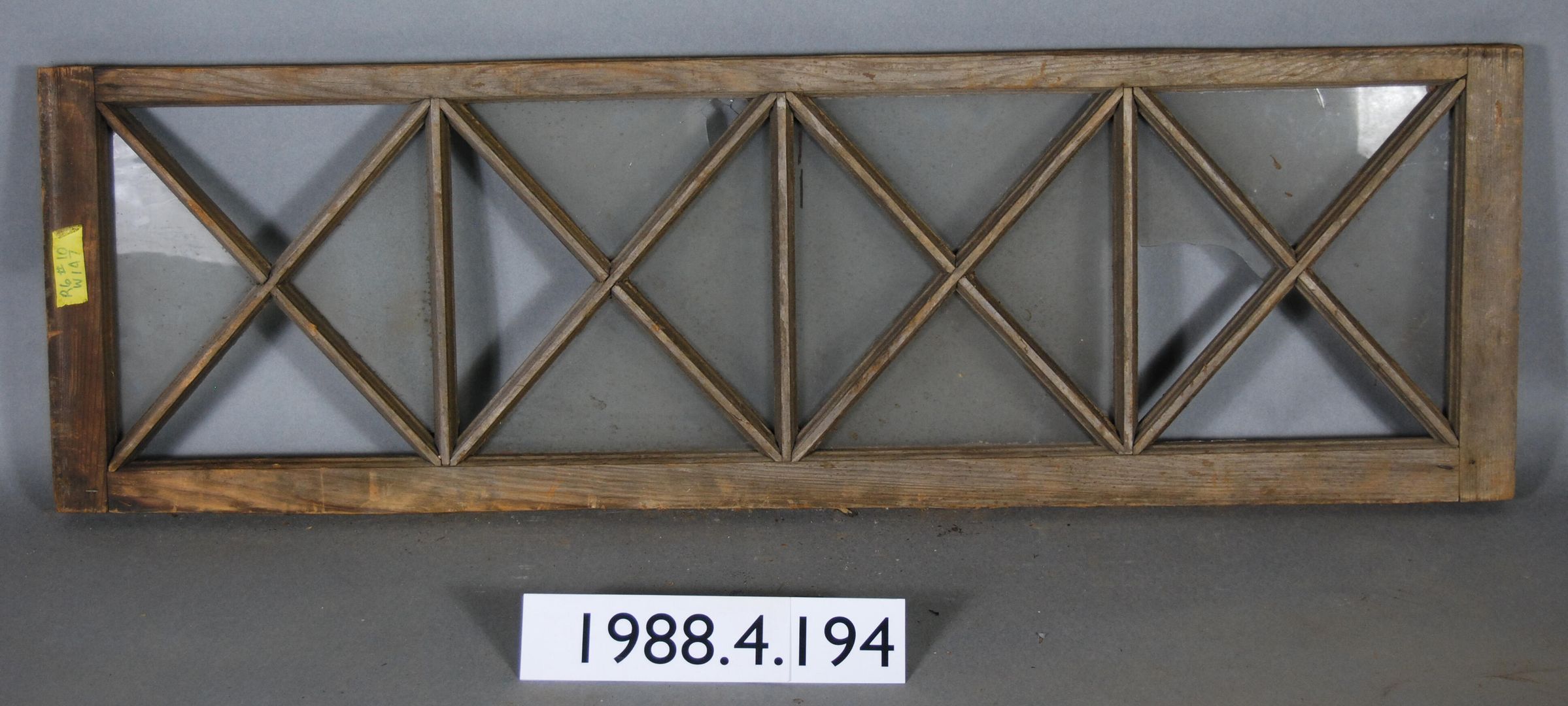 Rectangular. Mortice and tenon and coped joints. Sixteen triangular openings with ten complete glass panes. Remaining six panes broken or missing. Divided by muntins. Bottom rail has been modified / trimmed. Possibly originally part of larger sash.