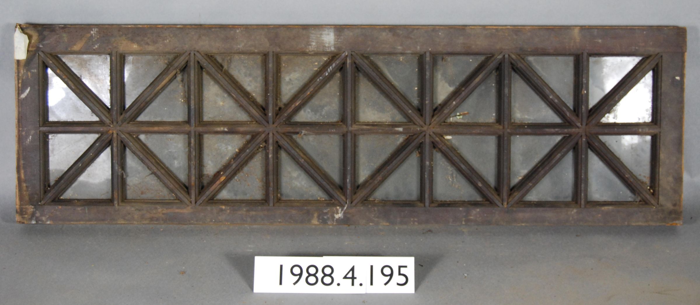 Rectangular. Mortice and tenon and coped joints. Thirty-two triangular openings with complete glass panes. Divided by muntins.