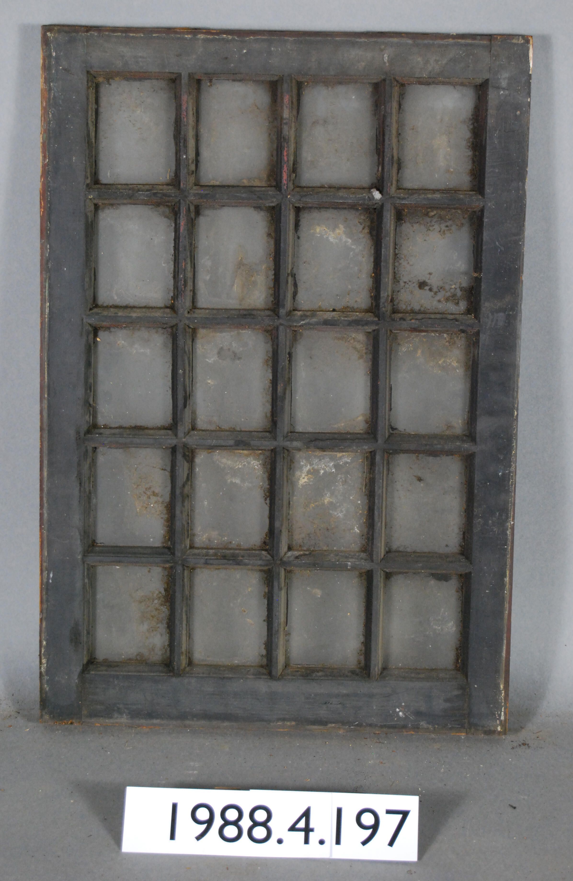 Rectangular. Mortice and tenon and coped joints. Twenty openings with twenty complete glass panes. Divided by muntins. Type: Fixed sash. Inscriptions or Markings: Manufacturer: Place of Manufacturer: Design motif: Style: Finish: Painted