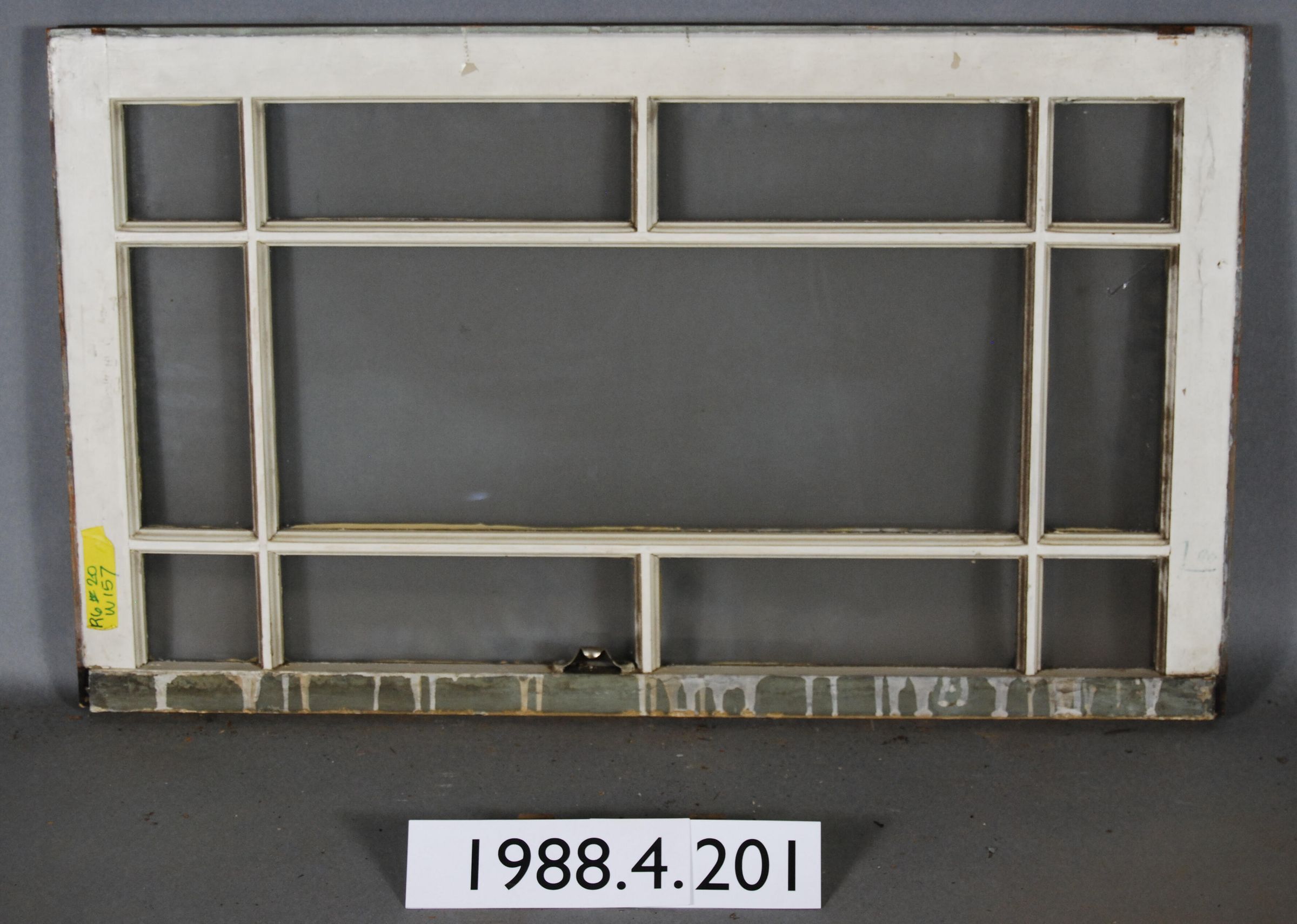 Rectangular. Mortice and tenon and coped joints. Segmented twelve openings. Eleven complete clear glass panes. One broken pane. Divided by muntins. Has latch hardware.