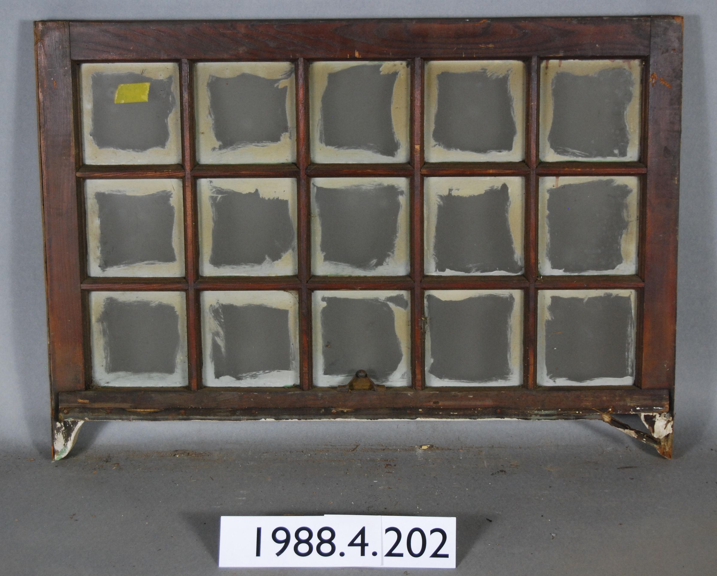 Rectangular. Mortice and tenon and coped joints. Segmented fifteen openings with complete glass panes. Divided by muntins. Has latch hardware.