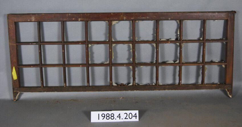 Rectangular. Mortice and tenon and coped joints. Segmented twenty-seven openings. Glass panes all broken / missing. Divided by muntins. Ogee lugs.