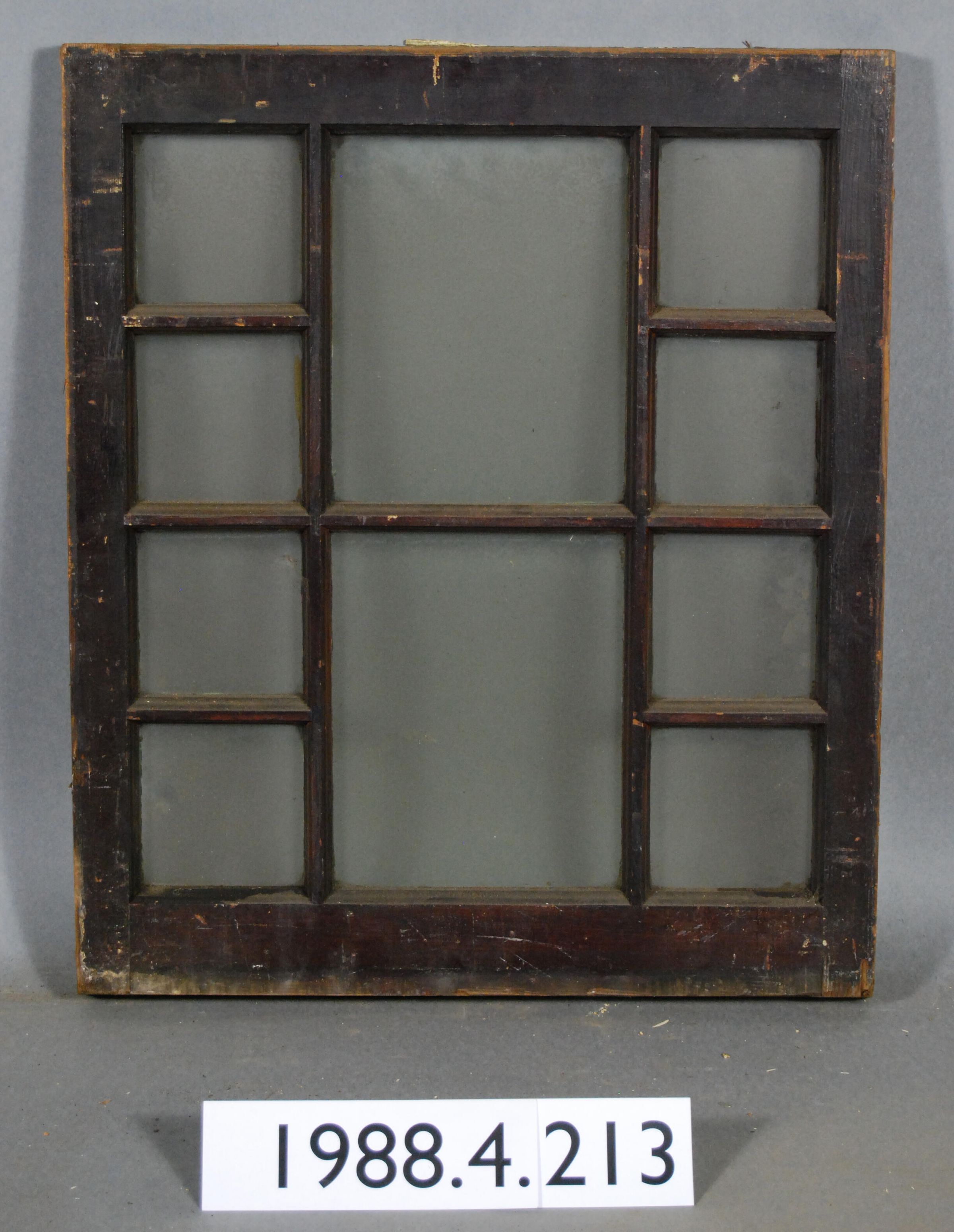 Rectangular. Mortice and tenon and coped joints. Segmented ten openings with complete glass panes. Divided by muntins. Type: Fixed sash. Inscriptions or Markings: Manufacturer: Place of Manufacturer: Design motif: Style: Finish: Painted