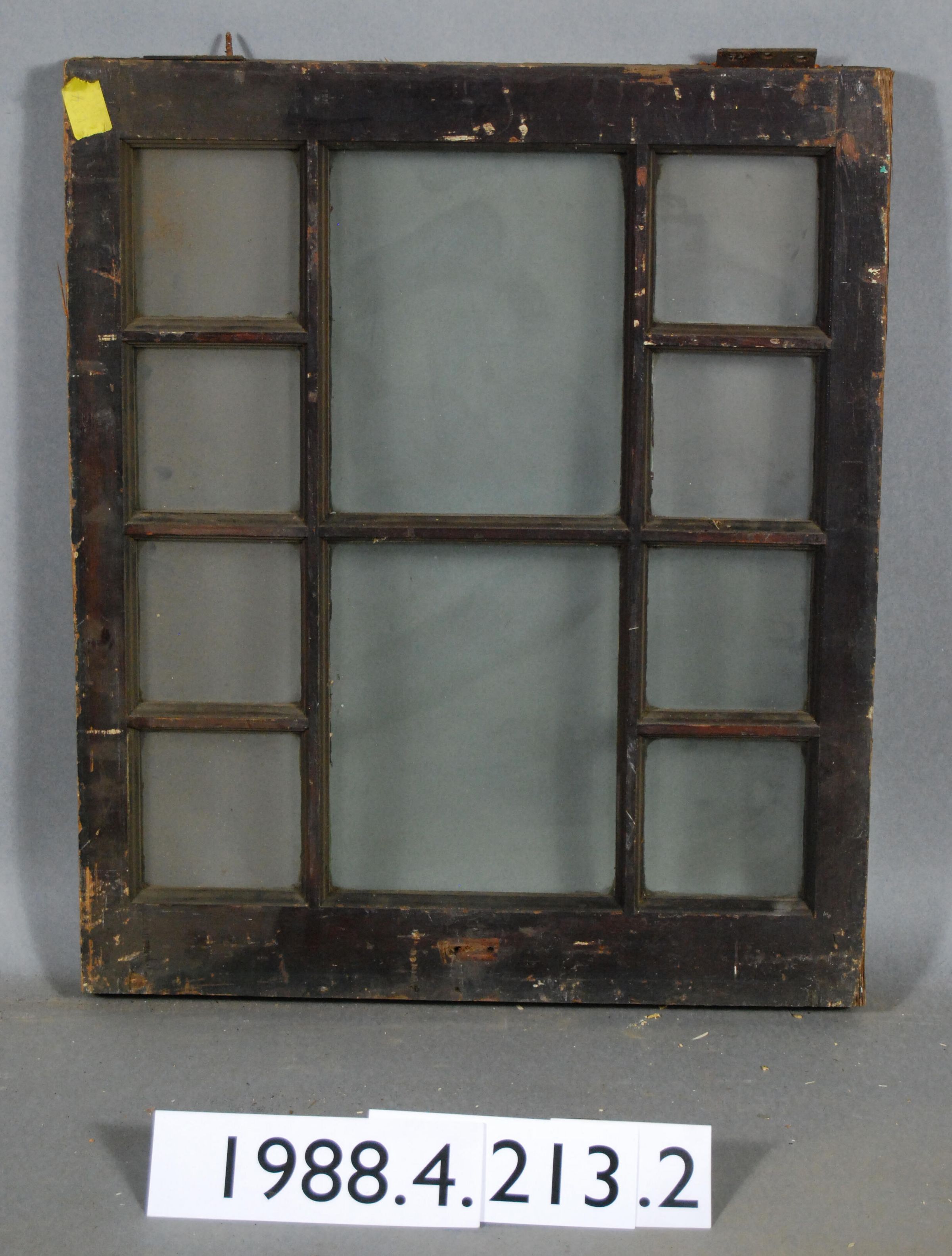 Rectangular. Mortice and tenon and coped joints. Segmented ten openings with complete glass panes. Divided by muntins. Two iron butt hinges mounted on top rail. Hood type hinged.
