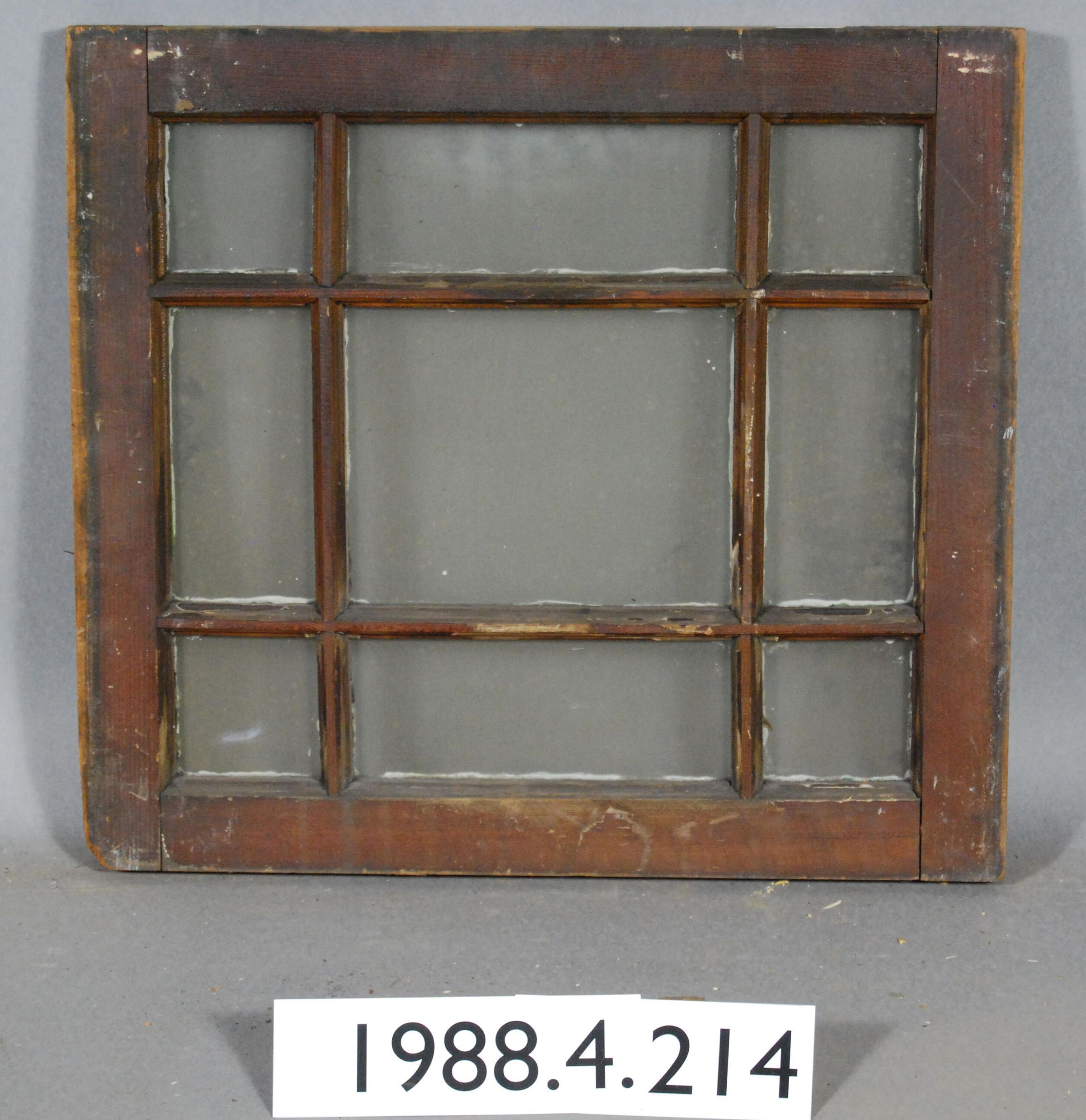 Rectangular. Mortice and tenon and coped joints. Segmented nine openings with complete glass panes. Divided by muntins. Type: Fixed sash. Inscriptions or Markings: Manufacturer: Place of Manufacturer: Design motif: Style: Finish: Painted