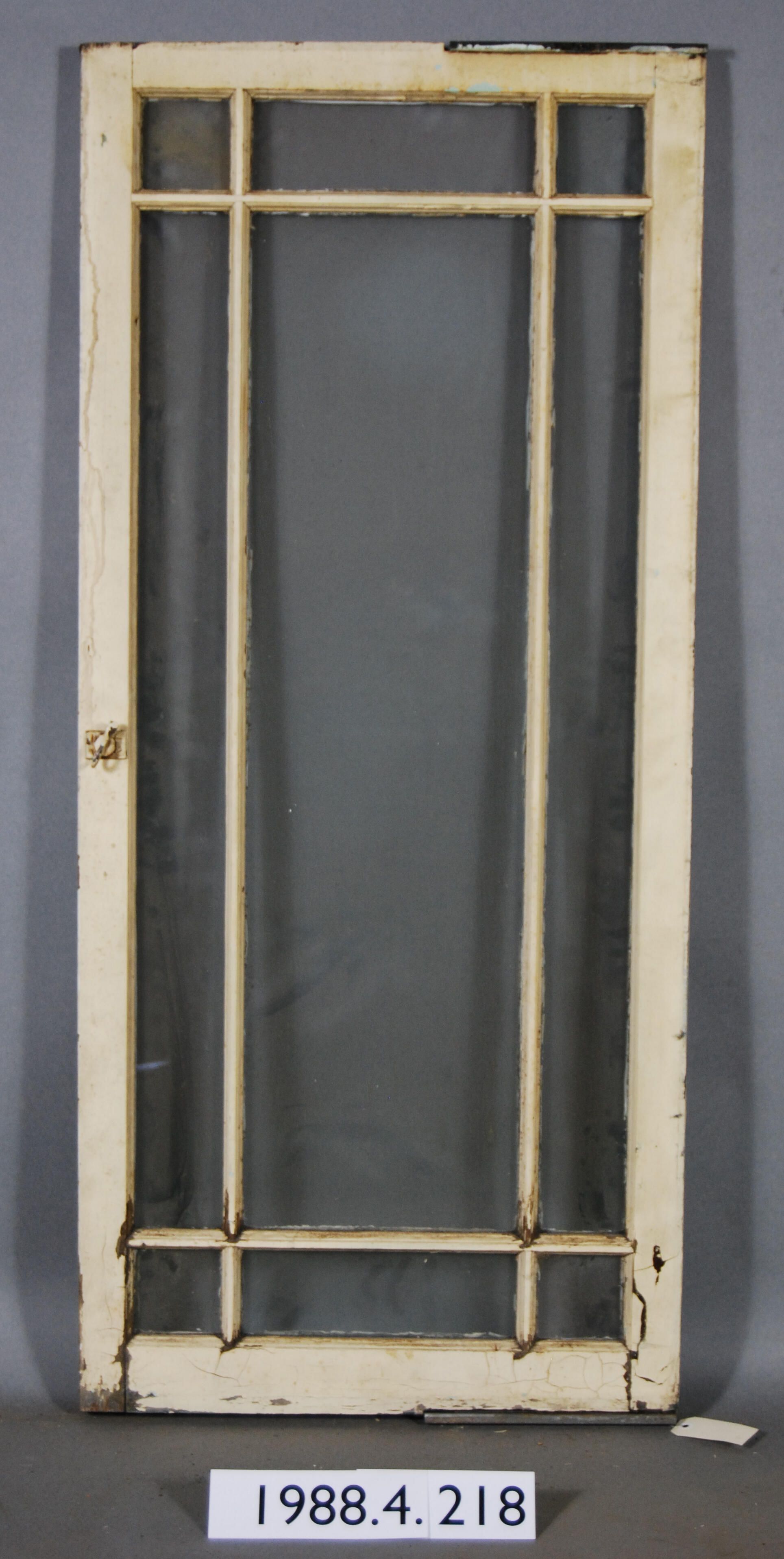 Rectangular. Mortice and tenon and coped joints. Segmented nine openings with complete glass panes. Divided by muntins. Has iron pivoting latch. Lever hinges at both top and bottom rails.