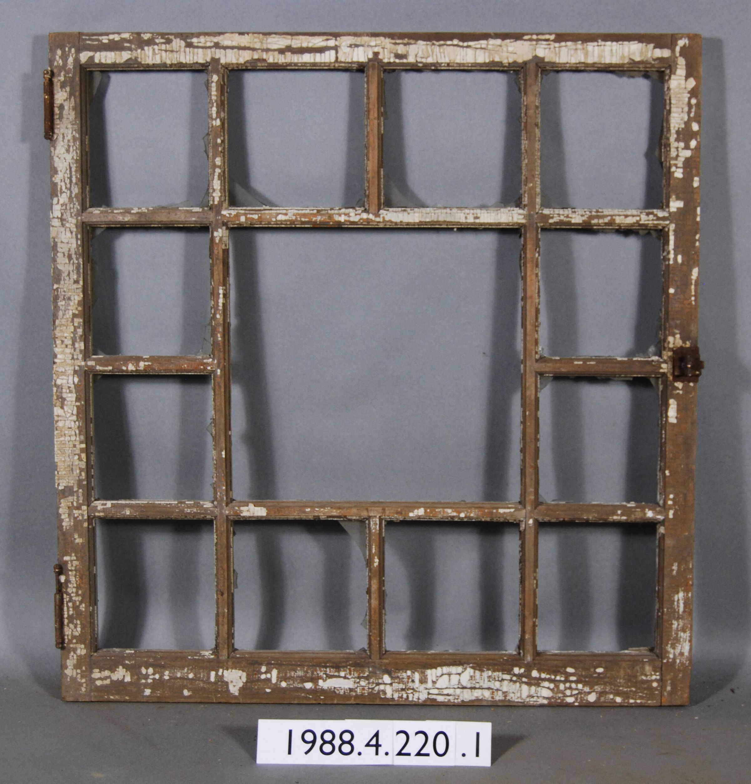Rectangular. Mortice and tenon and coped joints. Segmented thirteen openings. All glass panes broken / missing. Divided by muntins. Two incomplete butt hinges. Has iron latch with brass T-handle.