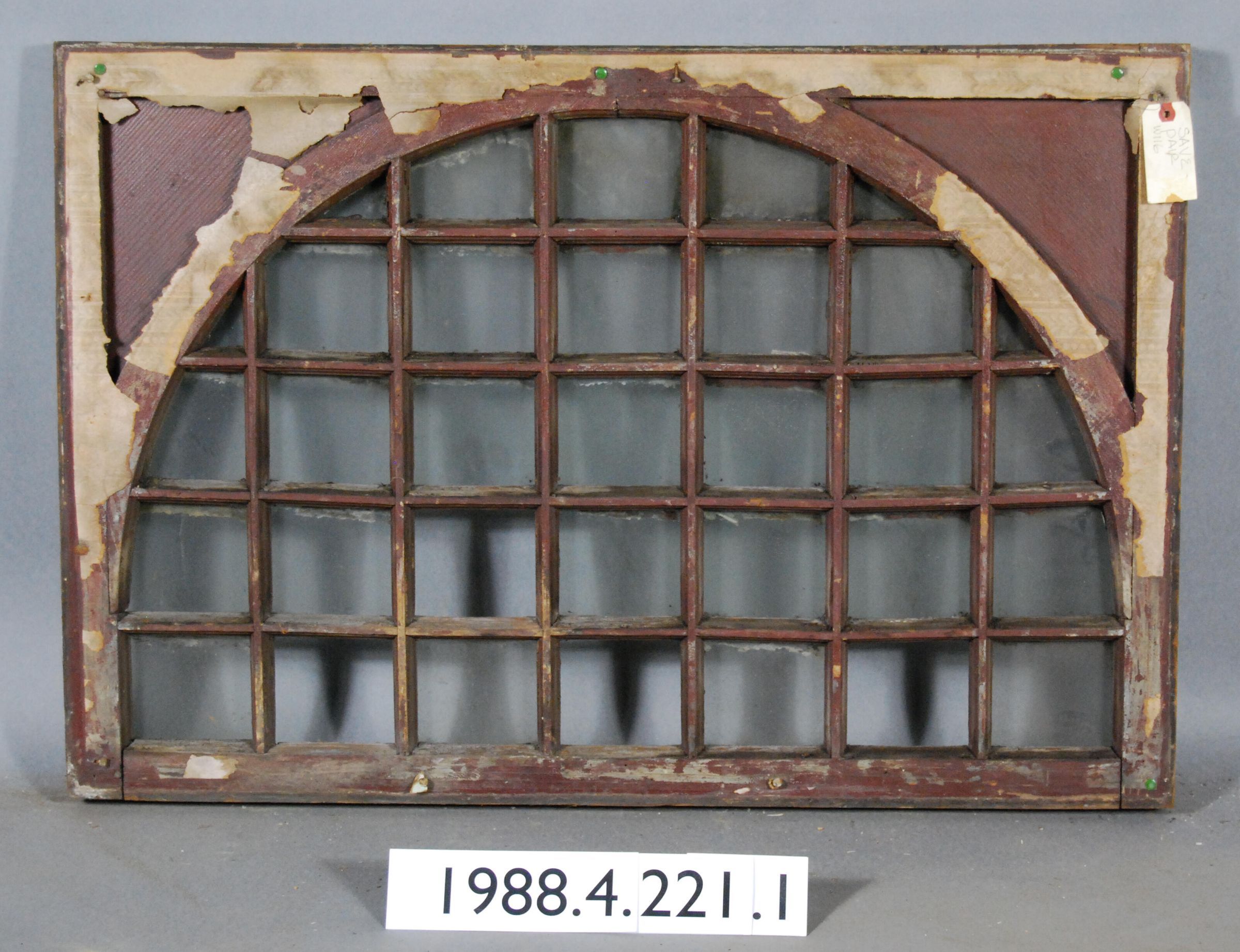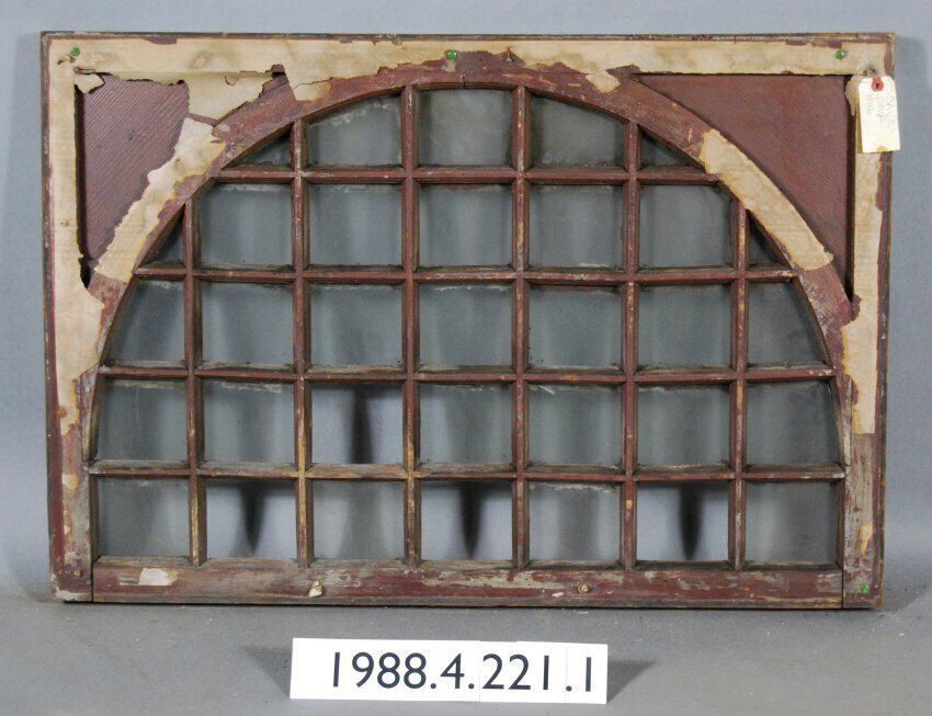 Rectangular. Mortice and tenon and coped joints. Segmented thirty-three openings. Thirty complete glass panes. Three missing panes. Divided by muntins within semi-circular configuration.