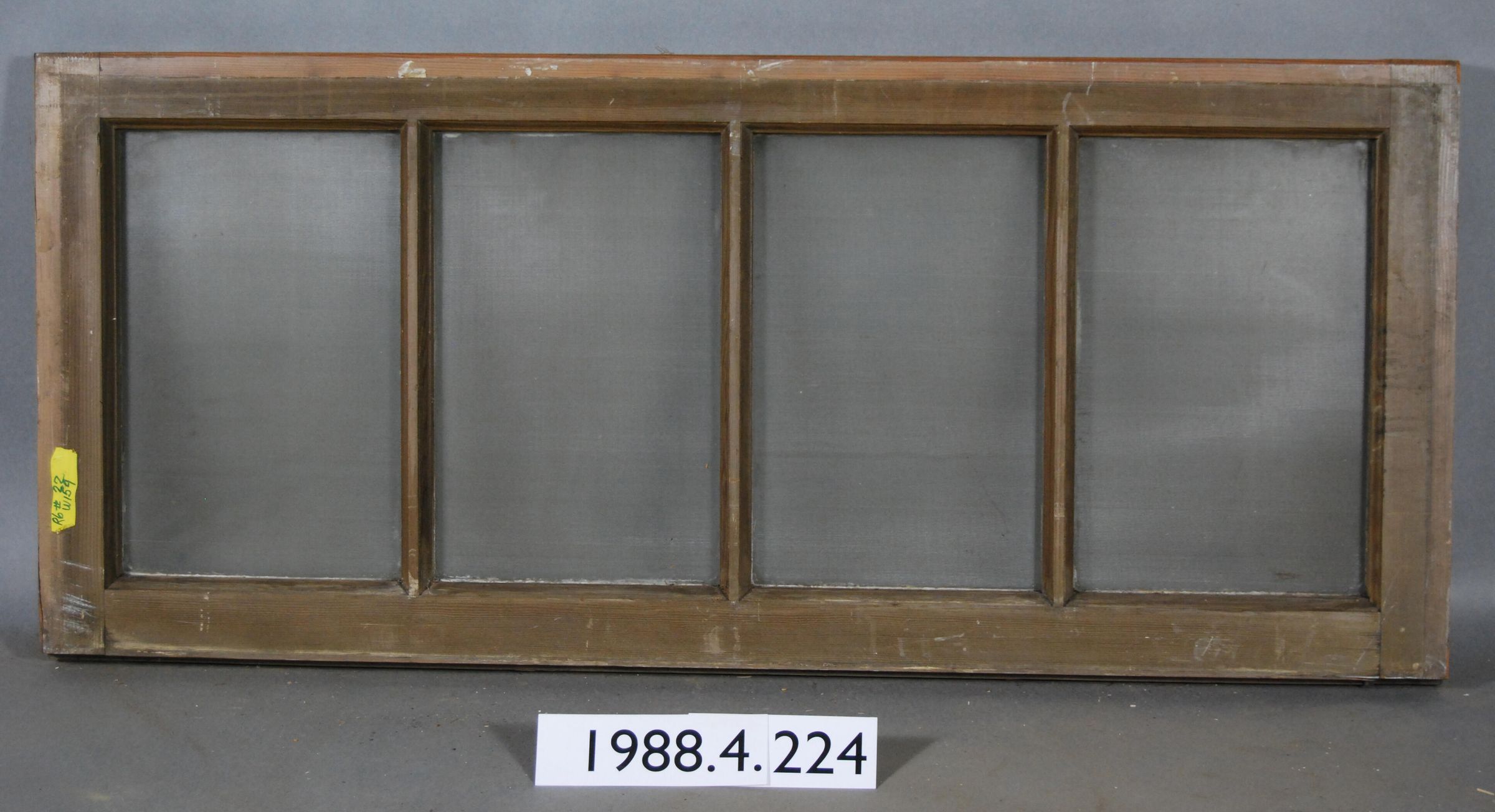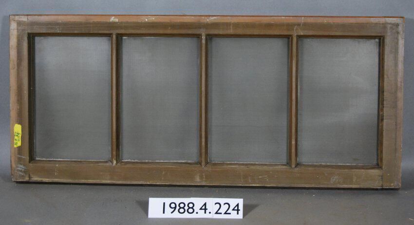 Rectangular. Mortice and tenon and coped joints. Segmented four openings with complete colorless translucent ribbed glass panes. Divided by vertical muntins. Type: Fixed sash. Inscriptions or Markings: Manufacturer: Place of Manufacturer: Design motif: Style: Finish: Painted