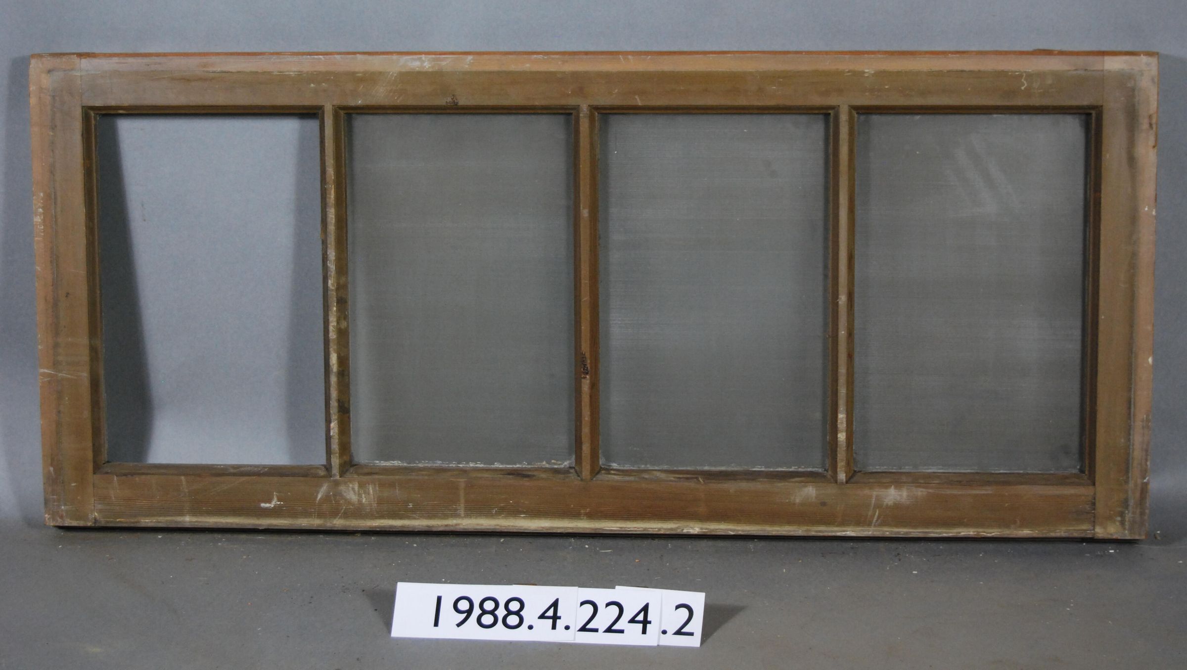 Rectangular. Mortice and tenon and coped joints. Segmented four openings with three complete colorless translucent ribbed glass panes. One missing pane. Divided by vertical muntins.