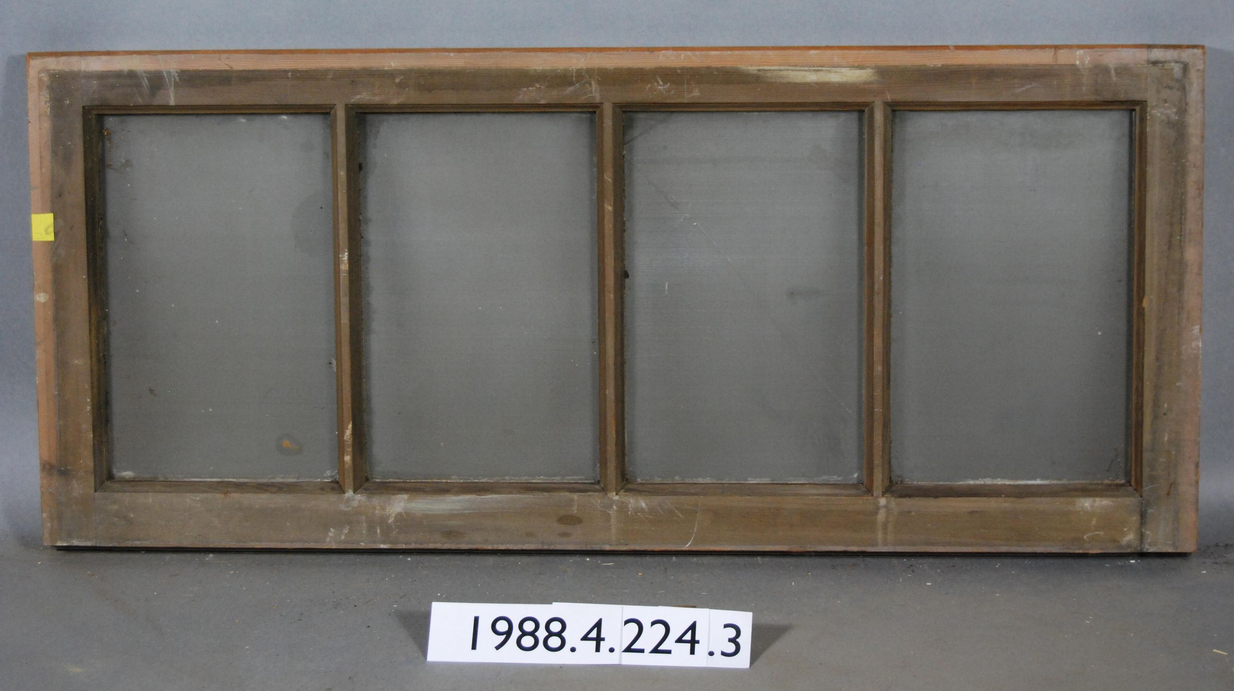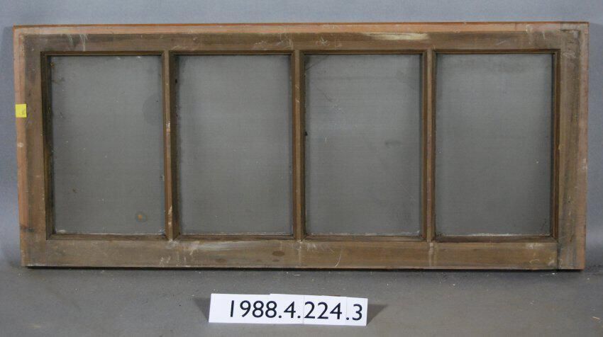 Rectangular. Mortice and tenon and coped joints. Segmented four openings with three complete colorless translucent ribbed glass panes. One missing pane. Divided by vertical muntins.
