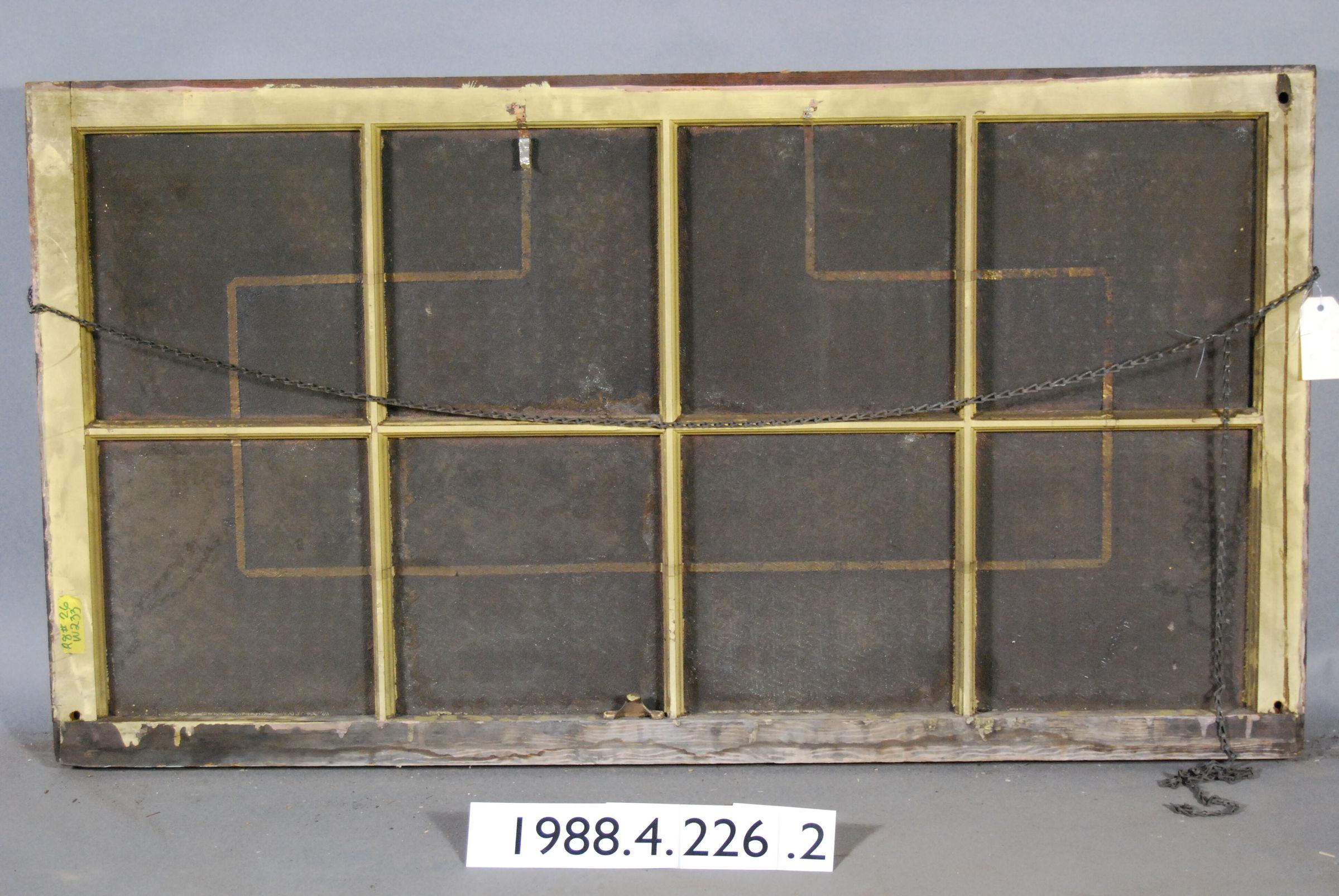 Rectangular. Mortice and tenon and coped joints. Eight openings with complete colorless molded pressed glass panes. Swirl pattern. Has metallic security alarm tape on interior. Has latch hardware. Has two iron ladder chains for sash cords.