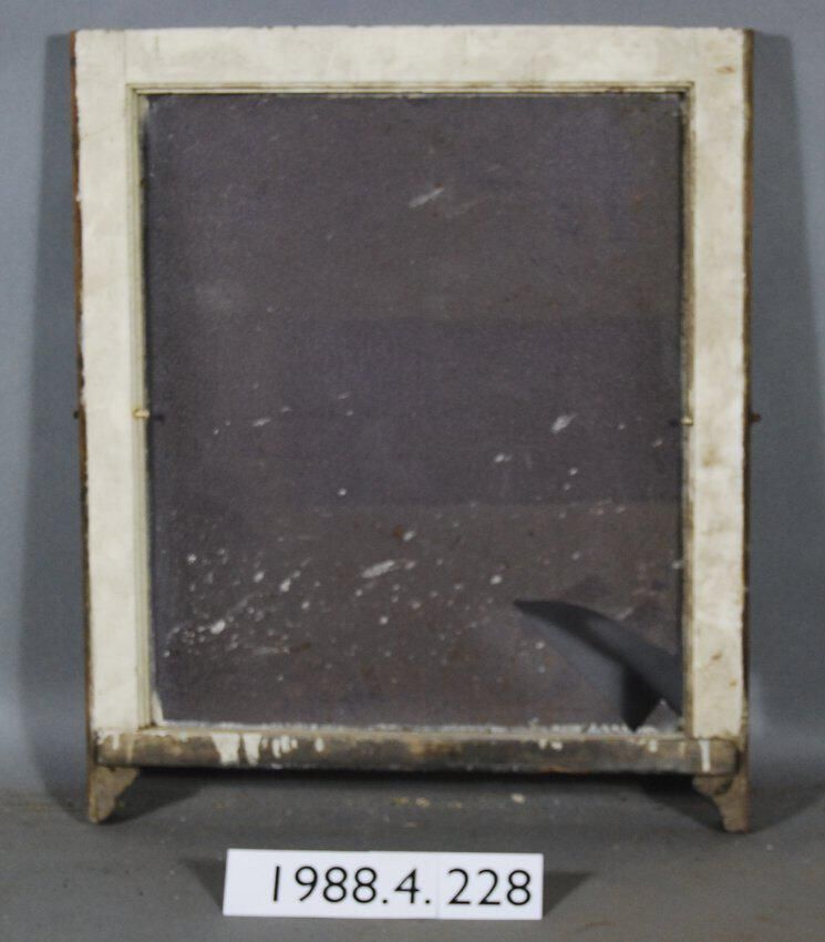 Rectangular. Mortice and tenon and coped joints. One opening with broken colorless pressed molded glass pane. Textured maze pattern. Has two spring bolt latches. Ogee lugs.