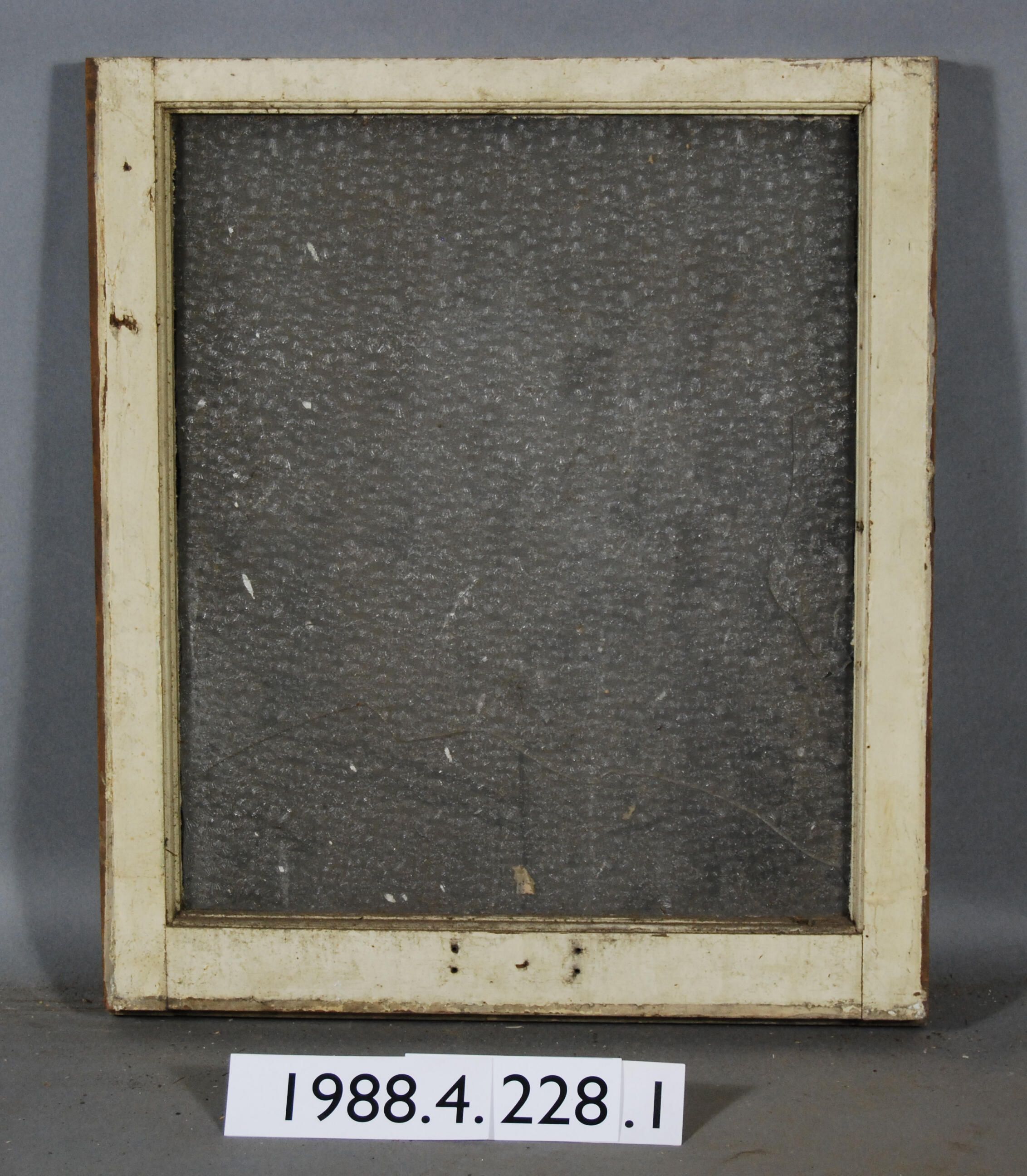 Rectangular. Mortice and tenon and coped joints. One opening with complete colorless pressed molded glass pane. Botanical pattern. Spring bolt and handle missing.