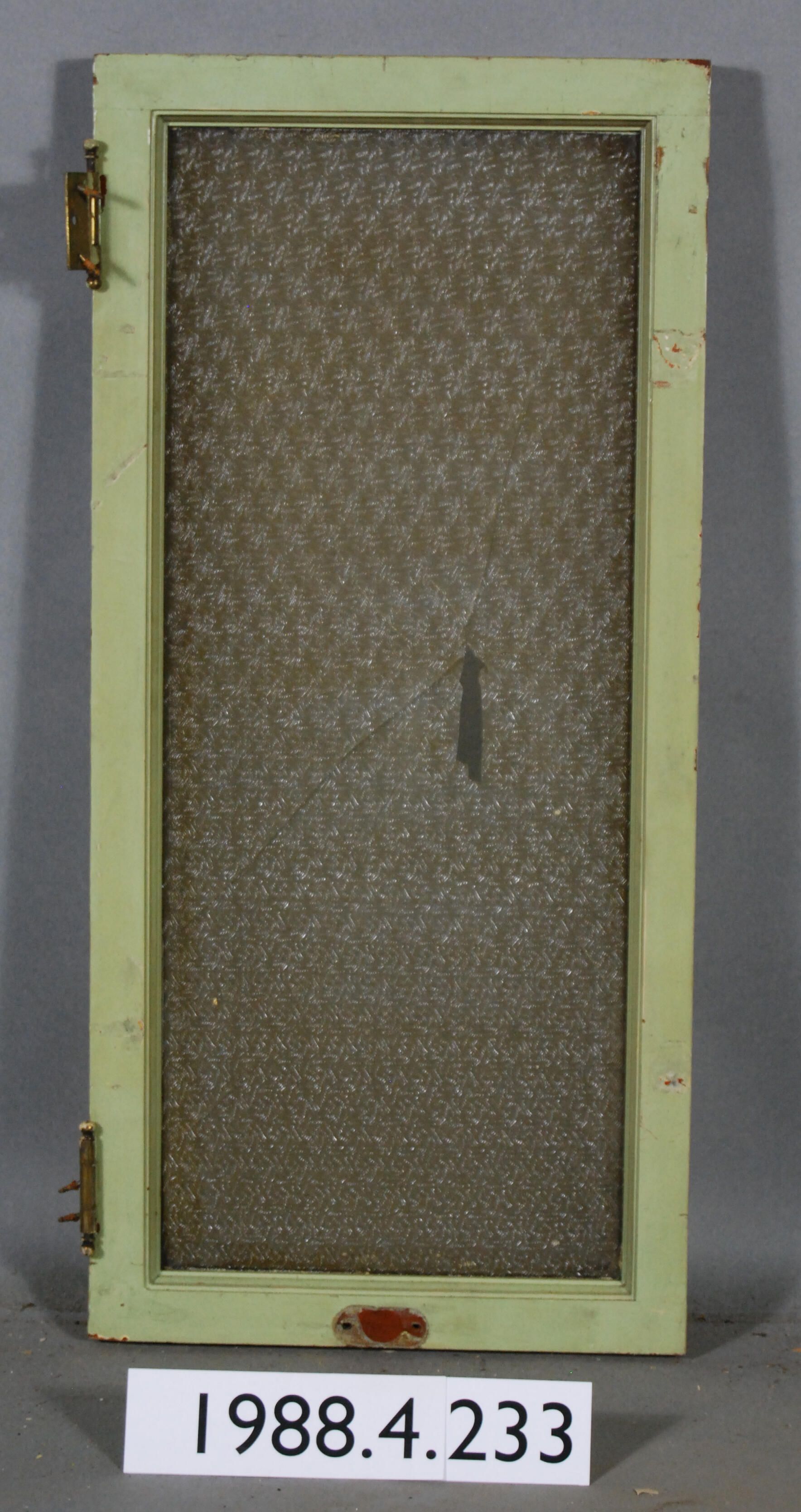 Rectangular. Mortice and tenon and coped joints. Broken colorless pressed molded glass pane. Swirl pattern. Two iron hinges on one edge.