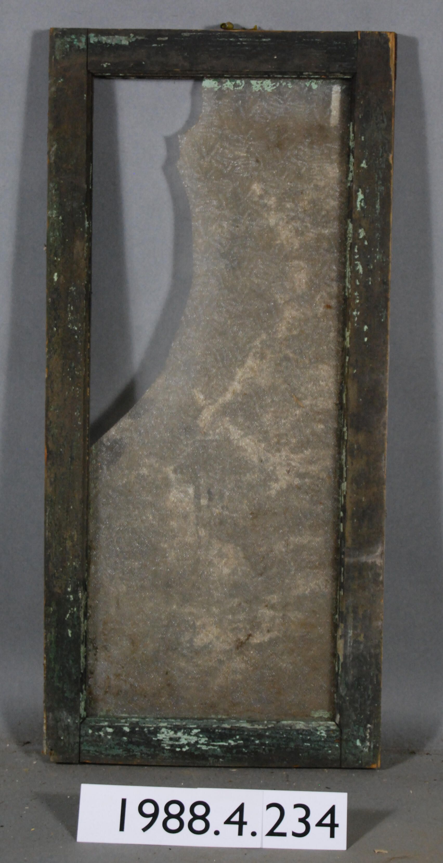 Rectangular. Mortice and tenon and coped joints. Broken colorless pressed molded glass pane. Ripple or swirl pattern. Hinges missing. Type: Hinged sash, possibly transom. Inscriptions or Markings: Manufacturer: Place of Manufacturer: Design motif: Style: Finish: Painted