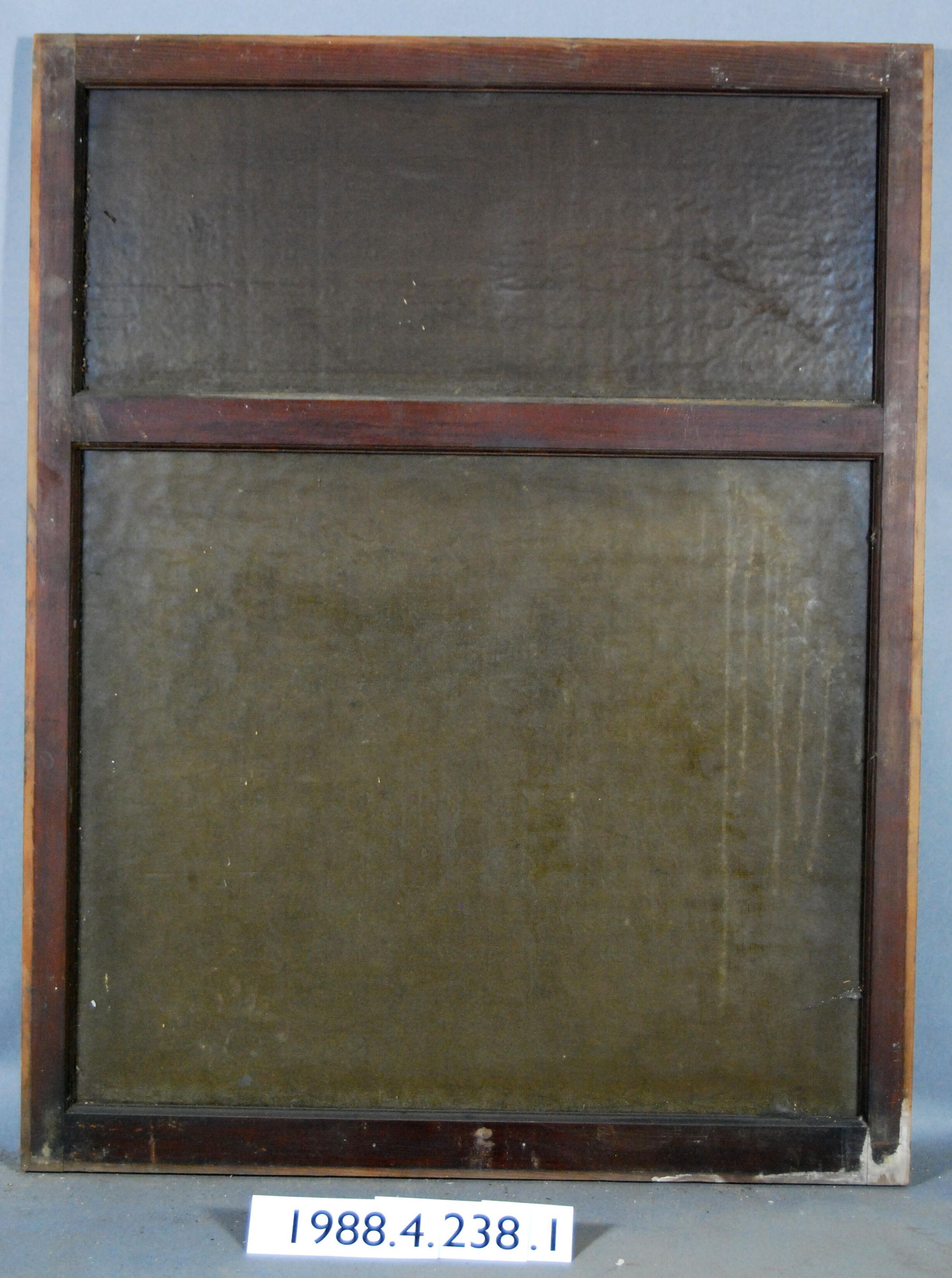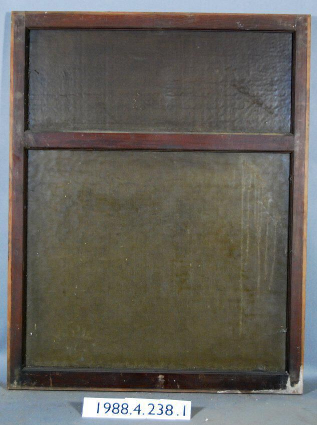 Rectangular. Mortice and tenon and coped joints. Two openings divided by mullion. Both with complete colorless pressed, molded glass panes. Ripple pattern. Type: Fixed sash Inscriptions or Markings: Manufacturer: Place of Manufacturer: Design motif: Style: Finish: Varnished