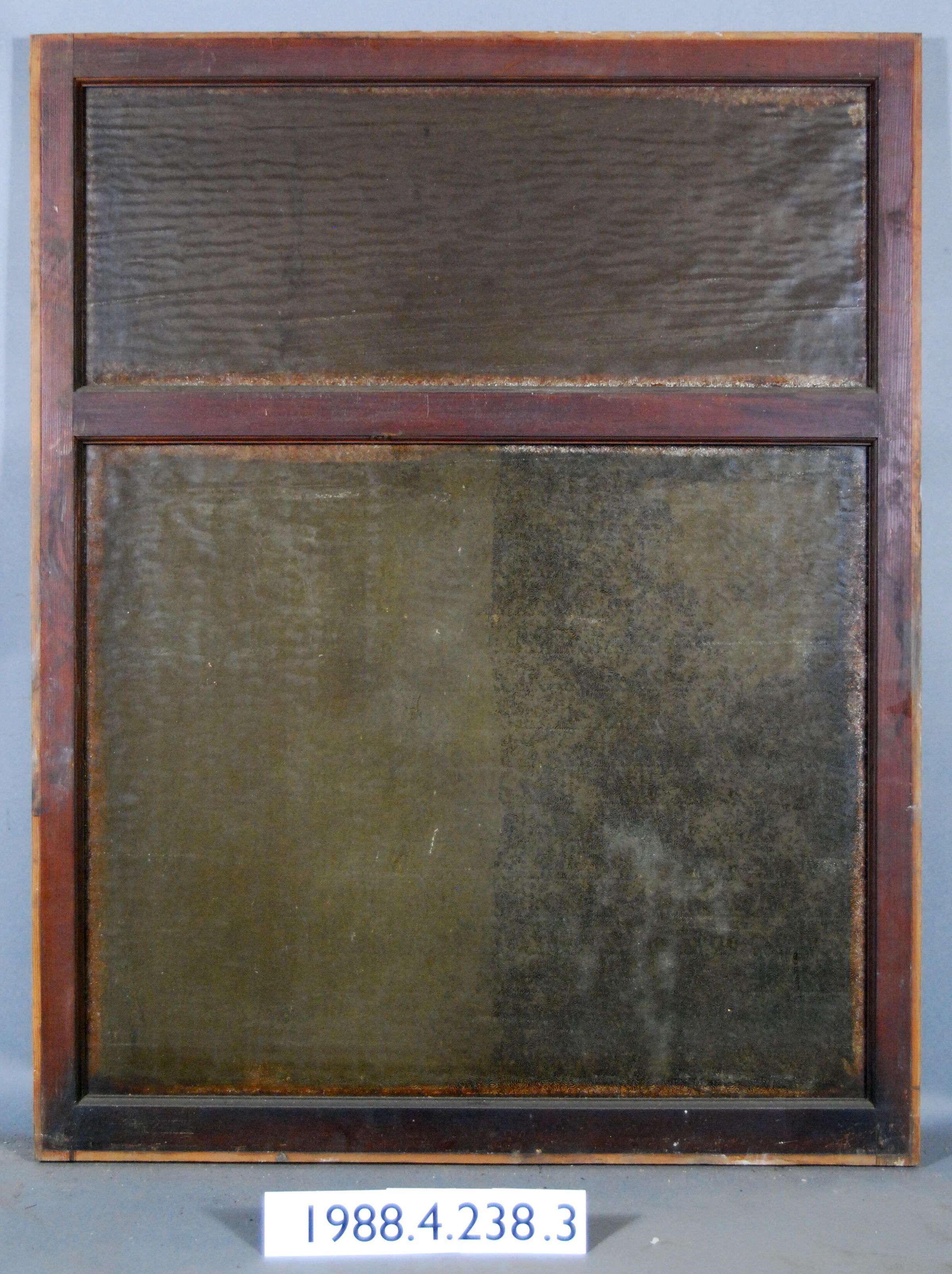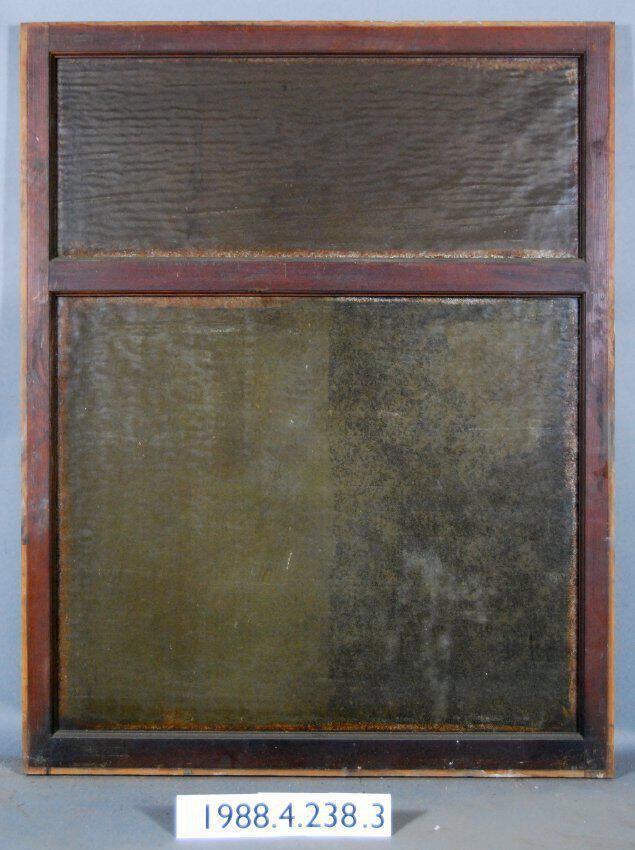 Rectangular. Mortice and tenon and coped joints. Two openings divided by mullion. Both with complete colorless pressed, molded glass panes. Ripple pattern.