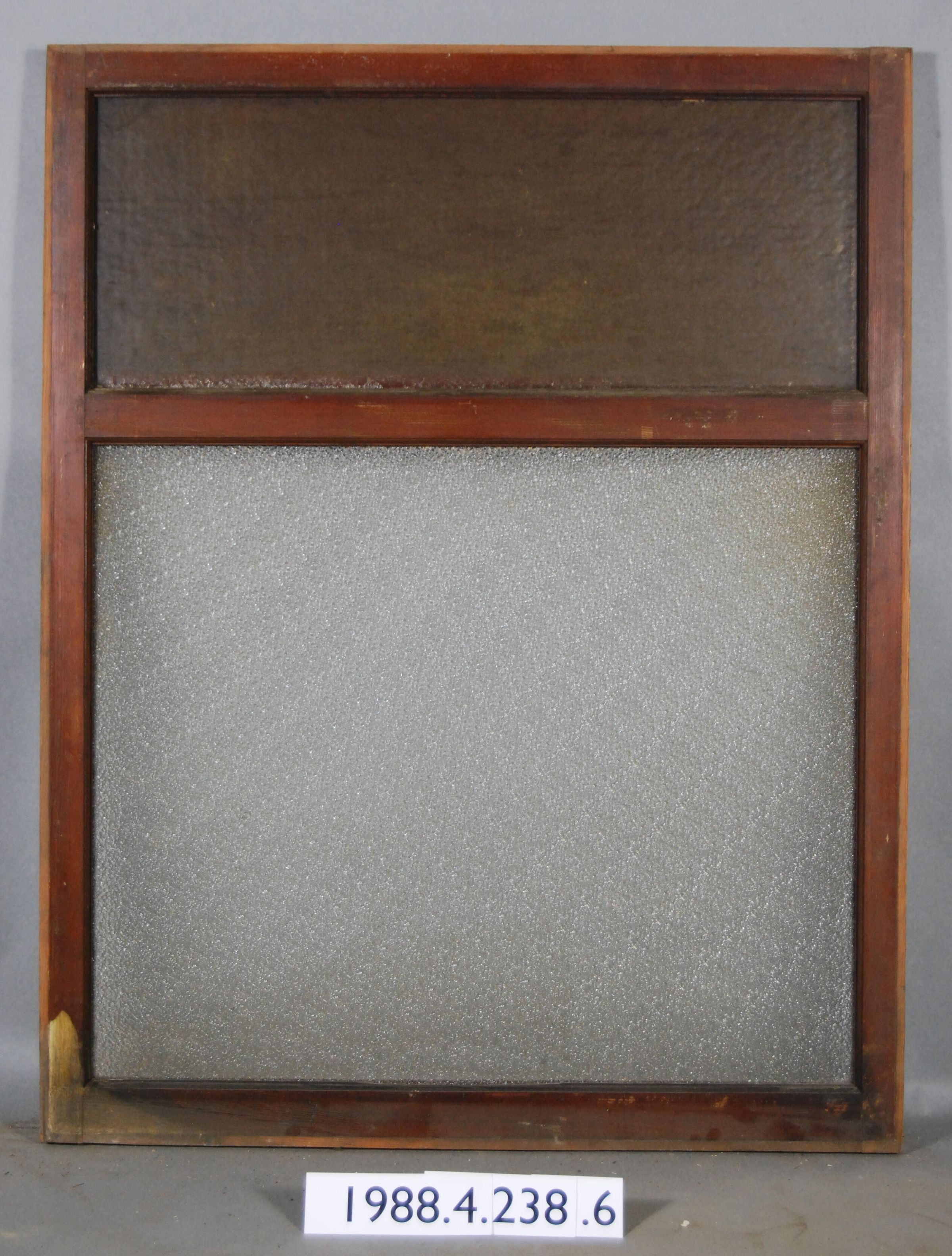 Rectangular. Mortice and tenon and coped joints. Two openings divided by mullion. Both with complete colorless pressed, molded glass panes. Upper is ripple pattern. Lower replaced with textured maze.